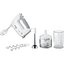 Обратите внимание на цвет миксера Бош — белый — он может стать как гармоничным дополнением кухонной обстановки, так и ярким акцентом. В комплекте с самим прибором идут дополнительные элементы: венчик для взбивания, измельчитель, крюки для теста, мерный стакан с крышкой, насадка-блендер.