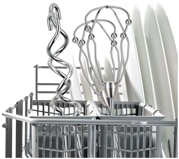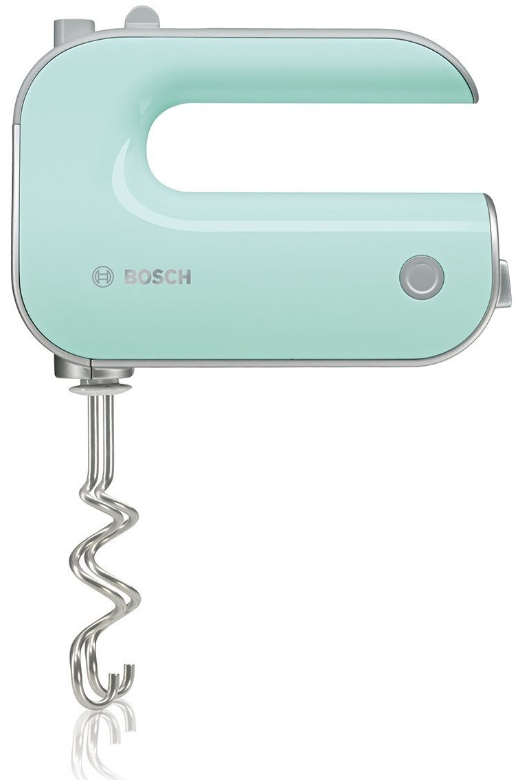 Обратите внимание на цвет миксера Бош — бирюзовый — он может стать как гармоничным дополнением кухонной обстановки, так и ярким акцентом. В комплекте с самим прибором идут дополнительные элементы: венчик для взбивания, крюки для теста.