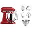 Обратите внимание на цвет миксера Китчен Эйд — красный — он может стать как гармоничным дополнением кухонной обстановки, так и ярким акцентом. В комплекте с самим прибором идут дополнительные элементы: венчик для взбивания, крюки для теста, насадка-лопатка для перемешивания, защитный обод, стальная чаша объемом 3 л, лопатка с гибким ребром.
