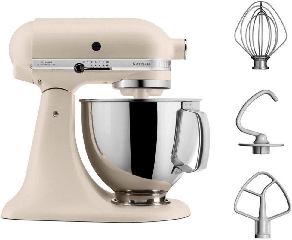 Обратите внимание на цвет миксера Китчен Эйд — кремовый — он может стать как гармоничным дополнением кухонной обстановки, так и ярким акцентом. В комплекте с самим прибором идут дополнительные элементы: венчик для взбивания, крюки для теста, насадка-лопатка для перемешивания.