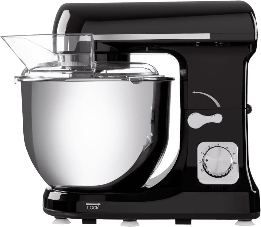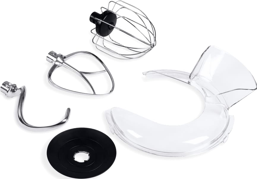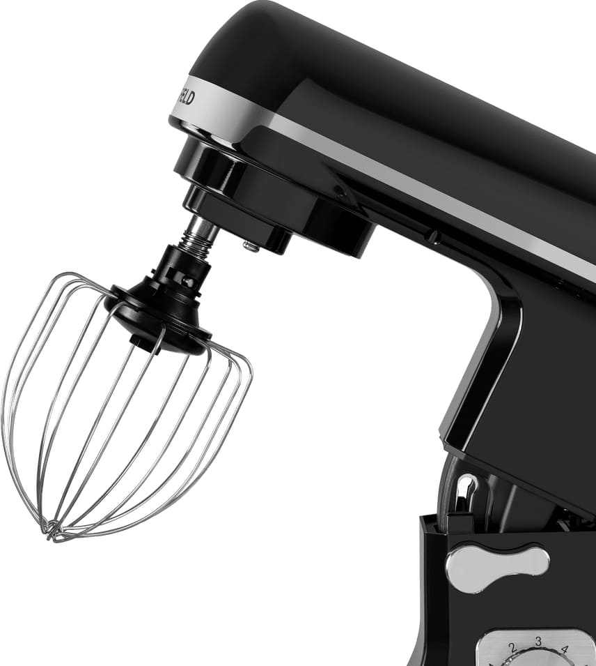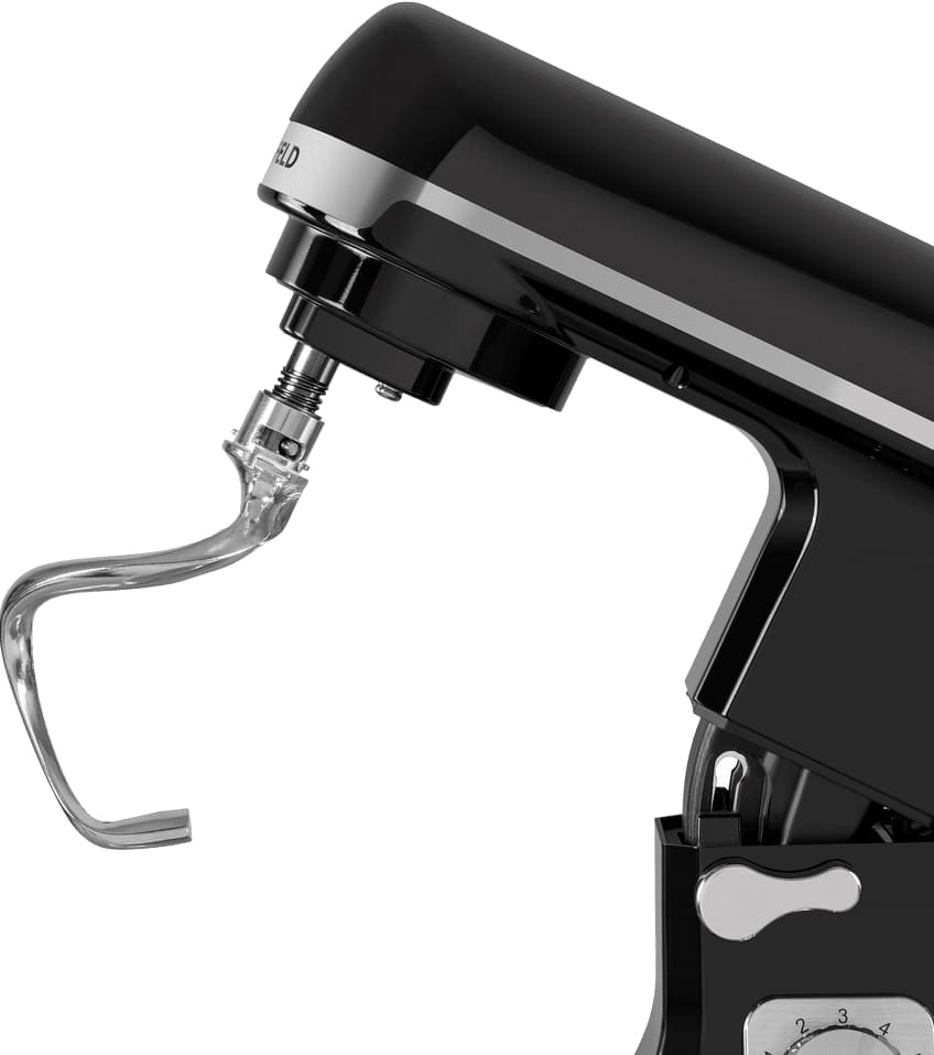 Обратите внимание на цвет миксера Маунфилд — черный — он может стать как гармоничным дополнением кухонной обстановки, так и ярким акцентом. В комплекте с самим прибором идут дополнительные элементы: венчик для взбивания, защитный обод с воронкой для засыпания продуктов, крюки для теста, насадка-лопатка для перемешивания.