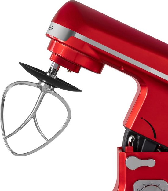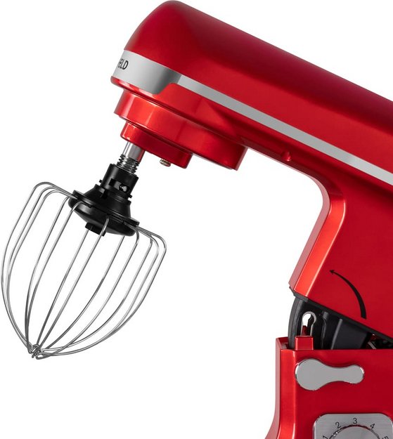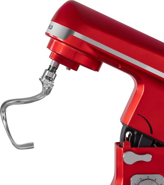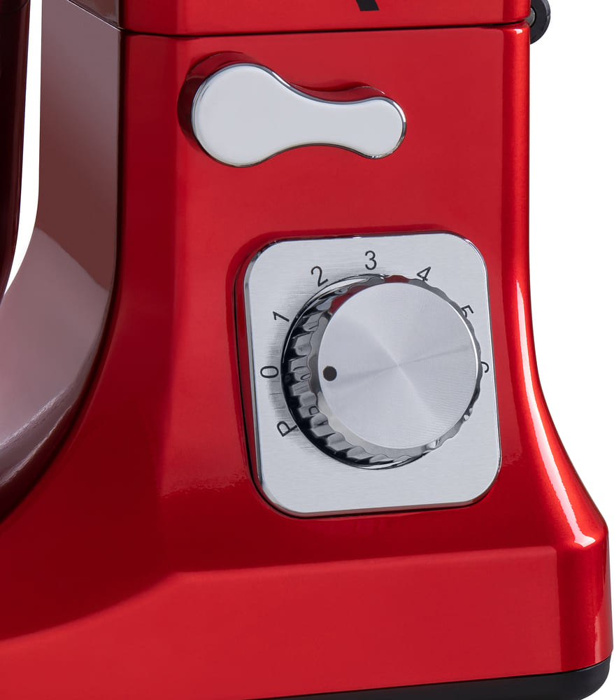 Обратите внимание на цвет миксера Маунфилд — вишня — он может стать как гармоничным дополнением кухонной обстановки, так и ярким акцентом. В комплекте с самим прибором идут дополнительные элементы: венчик для взбивания, защитный обод с воронкой для засыпания продуктов, крюки для теста, насадка-лопатка для перемешивания.