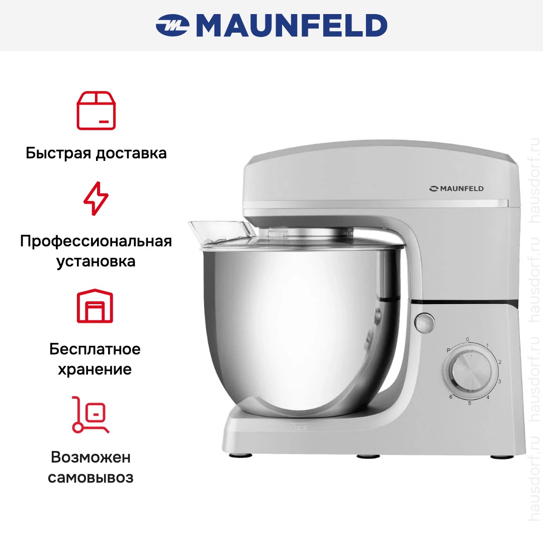 Стационарный миксер Maunfeld обладает высокой мощностью, работает автономно после выбора программ и справляется даже с густыми и вязкими текстурами. Оснащен технологией планетарного вращения: насадка движется не только по кругу чаши, но и вокруг своей оси, что сокращает время взбивания и гарантирует более однородный результат. Доступное количество скоростей — 6 шт.