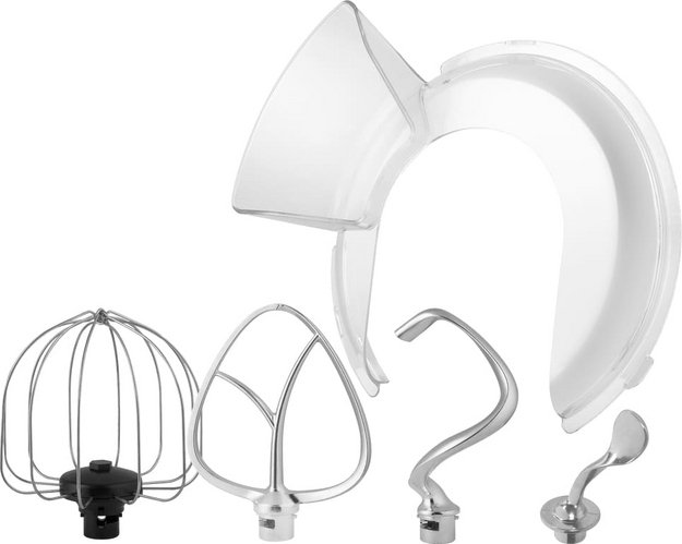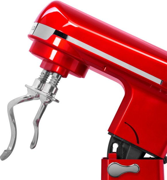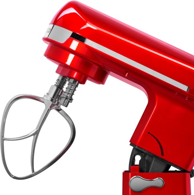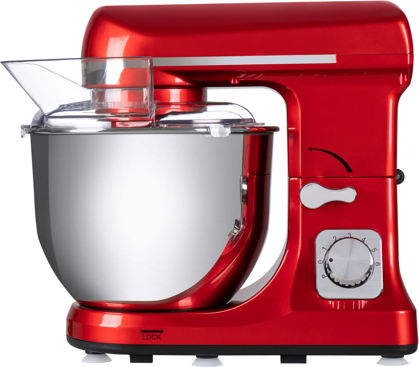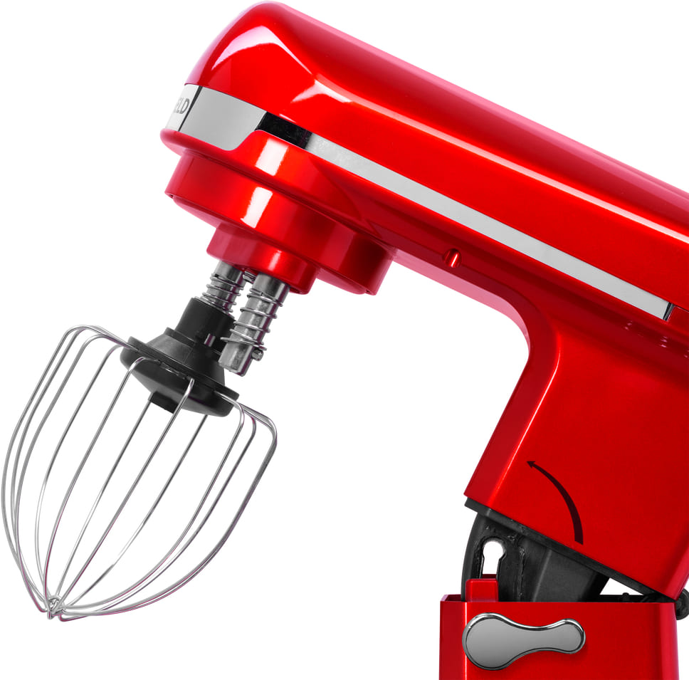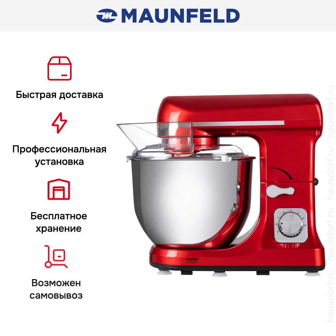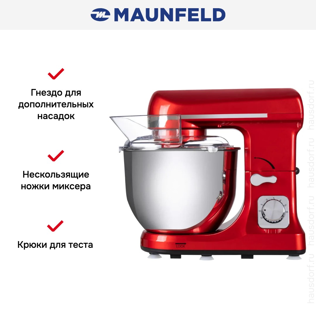 Обратите внимание на цвет миксера Маунфилд — вишня — он может стать как гармоничным дополнением кухонной обстановки, так и ярким акцентом. В комплекте с самим прибором идут дополнительные элементы: венчик для взбивания, защитный обод с воронкой для засыпания продуктов, крюки для теста, насадка-лопатка для перемешивания. Вы можете приобрести и установить другие насадки, для них создано специальное гнездо.