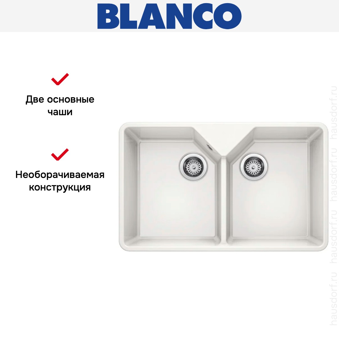 Обратите внимание на дизайнерские отличия мойки Бланко, которые помогут в создании идеальной кухни в вашем доме. Она выполнена в цвете глянцевый белый. Основной материал — керамика, за ней нужно тщательно и бережно ухаживать, зато такое исполнение добавляет интерьеру изящества.