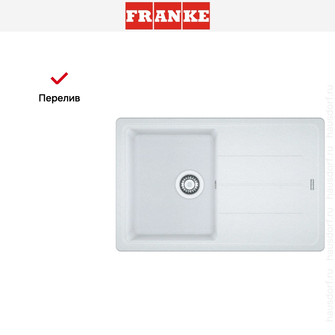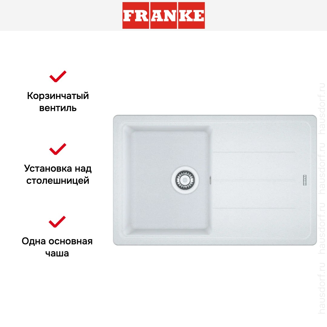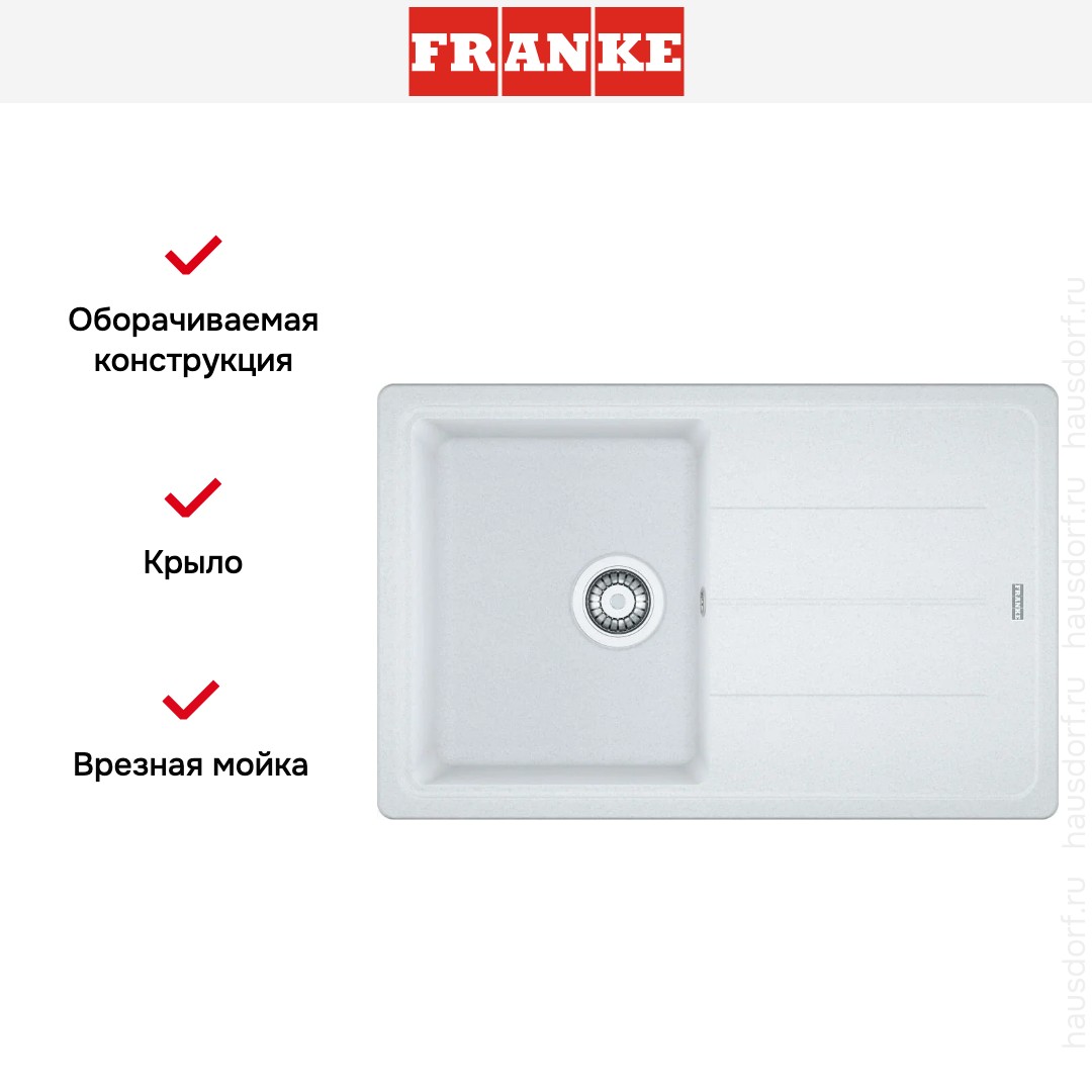 Мойка Franke BFG 611 78 белый. Эта врезная прямоугольная модель выполнена в лаконичном стиле Basis и привлекает внимание чистыми линиями и матовым белым покрытием. Компактные внешние габариты 78×50 см позволяют разместить её в кухне любого размера, а одновременно сохраняют удобную рабочую зону для подготовки продуктов и мытья посуды.