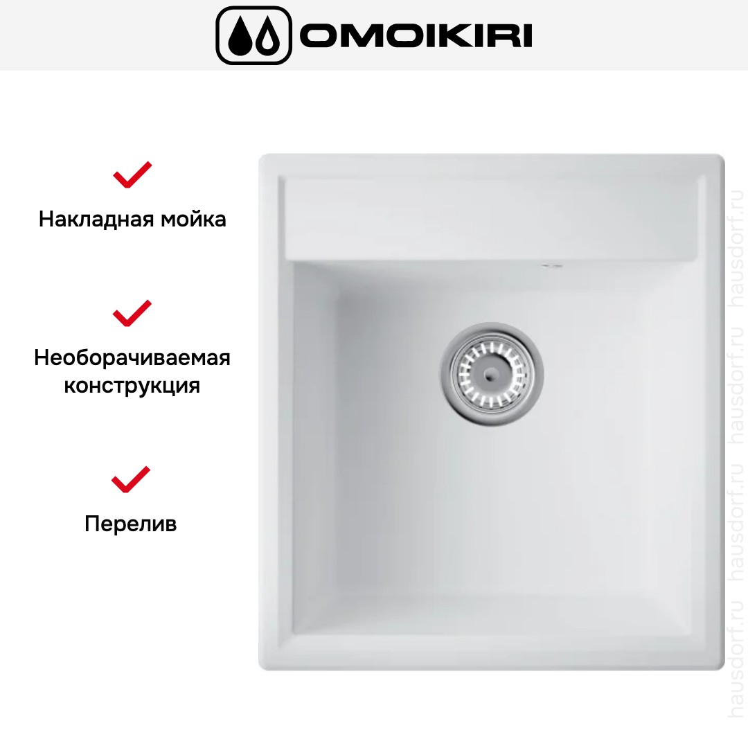 Накладная мойка Omoikiri — отличный выбор для тех, кто хочет создать гармоничное пространство с удобной сантехникой. простой в установке. Преимущество такой конструкции: легко подобрать практически к любой кухне и не придется демонтировать вместе с тумбой при ремонте или перестановке остальной мебели. Данная модель имеет стандартную форму, поэтому подходит большинству пользователей. Устанавливается над столешницей: это самый простой способ монтажа, зачастую с ним можно справиться даже без специалистов, главное — правильно рассчитать размеры ниши.