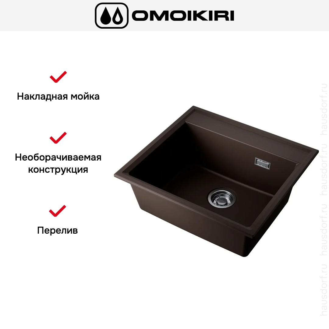 Omoikiri Daisen 57-ES — строгая и продуманная накладная мойка квадратной формы, которая станет акцентом современной кухни и позволит рационально организовать рабочее пространство. Компактные габариты 57×51 см делают её удобной для установки над столешницей в кухонных гарнитурах с базой 60 см, а монтажное отверстие 55×49 см обеспечивает точную врезку и аккуратный стык с поверхностью. Конструкция необорачиваемая разработана так, чтобы оставить оптимальную ориентацию чаши и перелива, при этом одна основная чаша размером 50×37 см и глубиной 19,5 см обеспечивает достаточный объём для мытья посуды и подготовки продуктов. Изготовленная методом литья из плотного ArtGranit толщиной 10 мм и тёплым оттенком эспрессо, эта модель сочетает насыщенный цвет и матовую текстуру, которые гармонично смотрятся в разных стилях интерьера, от минимализма до классики. Способ установки над столешницей упрощает монтаж при ремонте или замене старой мойки, а подготовленные размеры монтажного отверстия по ширине 55 см и глубине 49 см минимизируют работу по доработке столешницы. Практичность проявляется в наличии перелива, что повышает безопасность и исключает риск переполнения, а корзинчатый вентиль в комплекте облегчает отвод воды и удобен в обслуживании. Фиксирующие зажимы обеспечивают надёжное крепление к поверхности, позволяя сохранить плотное прилегание без щелей, а в комплект поставки включён сифон для быстрой и полной готовности к эксплуатации после установки. Квадратная форма визуально упрощает зонирование и совместима с встроенными аксессуарами, при этом размеры чаши дают простор для размещения кастрюль и сковород, а аккуратные внешние линии подчёркивают геометрическую ясность. Эспрессо-оттенок придаёт кухонной зоне глубину и уют, не требуя сложного ухода: поверхность ArtGranit устойчива к бытовым нагрузкам и легко поддаётся чистке рекомендованными средствами без агрессивного абразива. За счёт грамотно спроектированных параметров — ширина мойки 57 см и общая глубина 51 см — модель экономит место на столешнице, сохраняя функциональность полноценной мойки с одной чашей. Особенности монтажа и подготовленные габариты делают установку быстрой и предсказуемой, а профессиональная литьёвая технология гарантирует однородность структуры и стабильность оттенка по всей площади изделия. Для тех, кто ценит сочетание лаконичного облика и эксплуатационной надёжности, эта мойка предлагает правильный баланс: компактность, объём основной чаши, аккуратный профиль и готовый набор элементов для подключения. Модель прекрасно впишется в кухонную планировку, где важна аккуратность швов, удобство в обслуживании и продуманный дизайн, подчёркивая стиль помещения и создавая комфортную зону для ежедневной работы на кухне. Omoikiri — бренд, который учитывает нюансы домашней эксплуатации и предлагает готовое решение для грамотной организации пространства.
