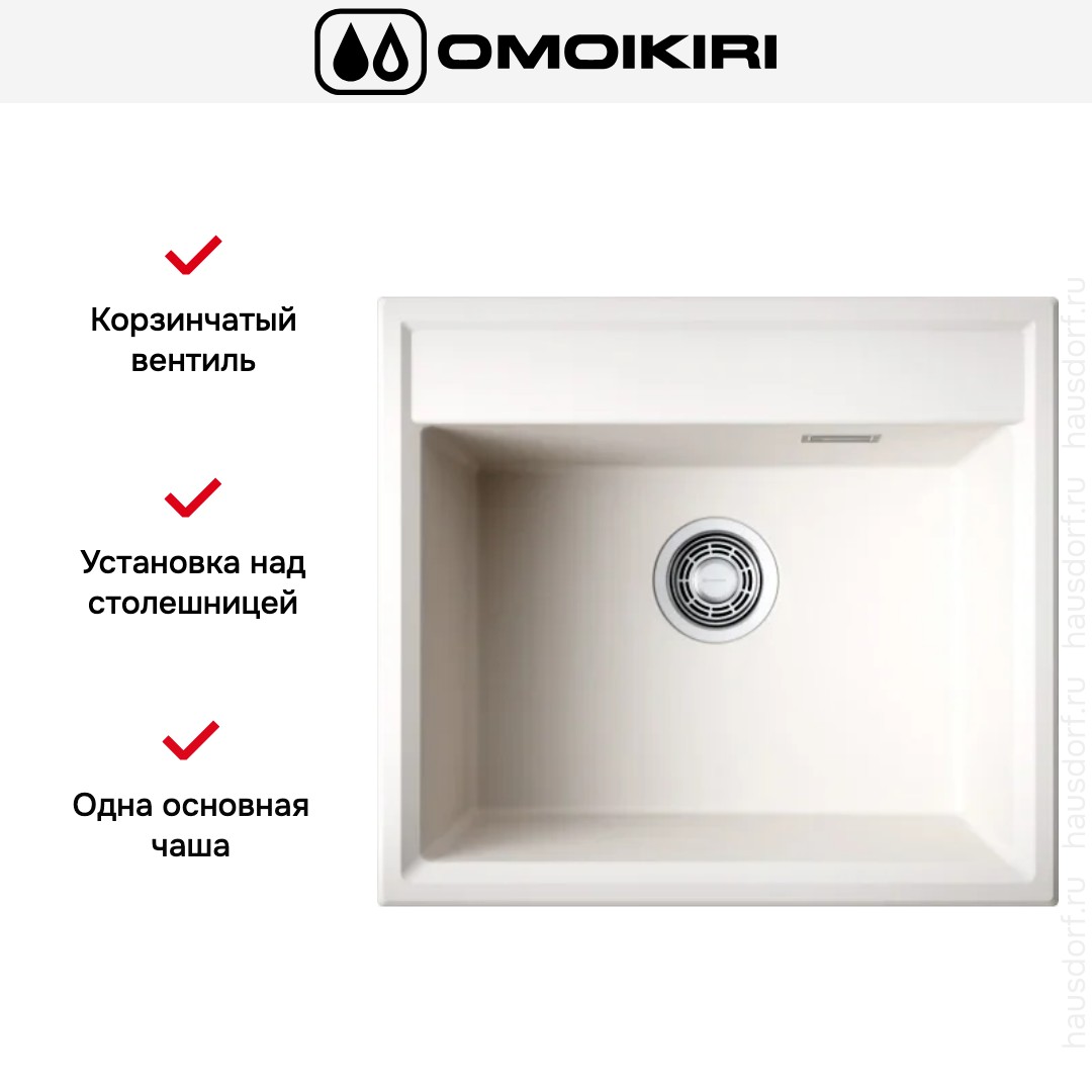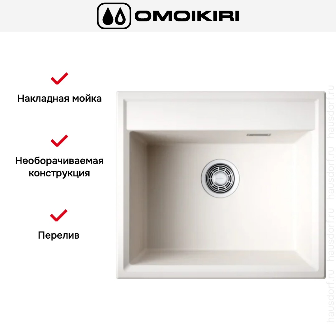 Накладная мойка Omoikiri — отличный выбор для тех, кто хочет создать гармоничное пространство с удобной сантехникой. простой в установке. Преимущество такой конструкции: легко подобрать практически к любой кухне и не придется демонтировать вместе с тумбой при ремонте или перестановке остальной мебели. Данная модель имеет стандартную форму, поэтому подходит большинству пользователей. Устанавливается над столешницей: это самый простой способ монтажа, зачастую с ним можно справиться даже без специалистов, главное — правильно рассчитать размеры ниши.