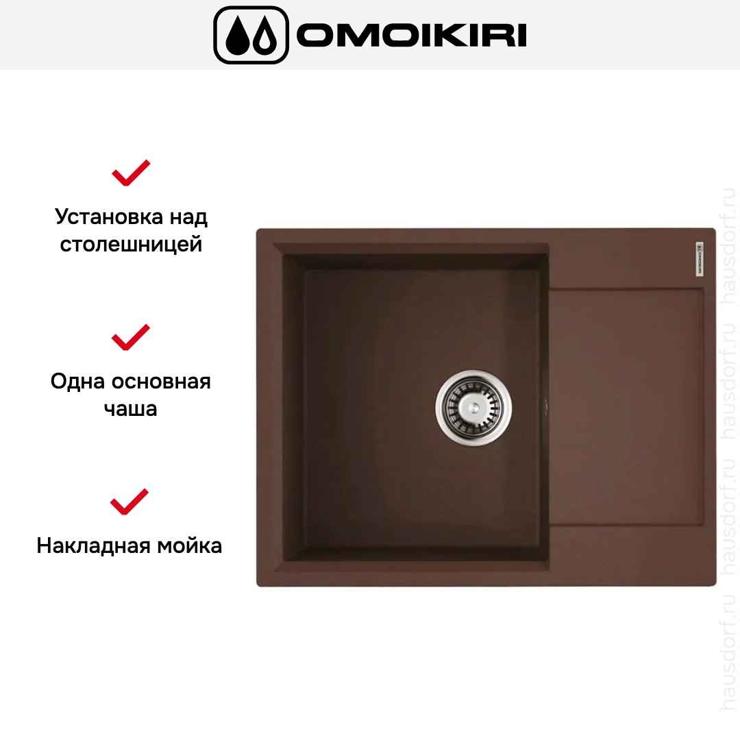 Мойка Omoikiri Daisen 65T DC — стильное и практичное решение для современной кухни, где гармония форм сочетается с продуманной функциональностью. Прямоугольная накладная конструкция габаритами 6551 см выигрывает за счёт аккуратных линий и глубокого тёмно-шоколадного оттенка. Тёплая, насыщенная палитра придаёт интерьеру уют и легко комбинируется с деревом, матовым металлом или светлыми стёклами. Композитный материал TetoGranit обеспечивает однородную поверхность и натуральную текстуру, делая внешний вид более эффектным по сравнению с обычными изделиями.