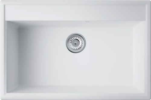 Выглядит лаконично и уверенно: прямоугольная геометрия с четкими линиями, белого цвета, с пропорциями 77×51 см. Плоскости ровные, контуры строгие, модель органично занимает свое место на рабочей поверхности и не перегружает ее визуально. Неширокая площадка в задней части может использоваться для размещения губок и моющих средств.