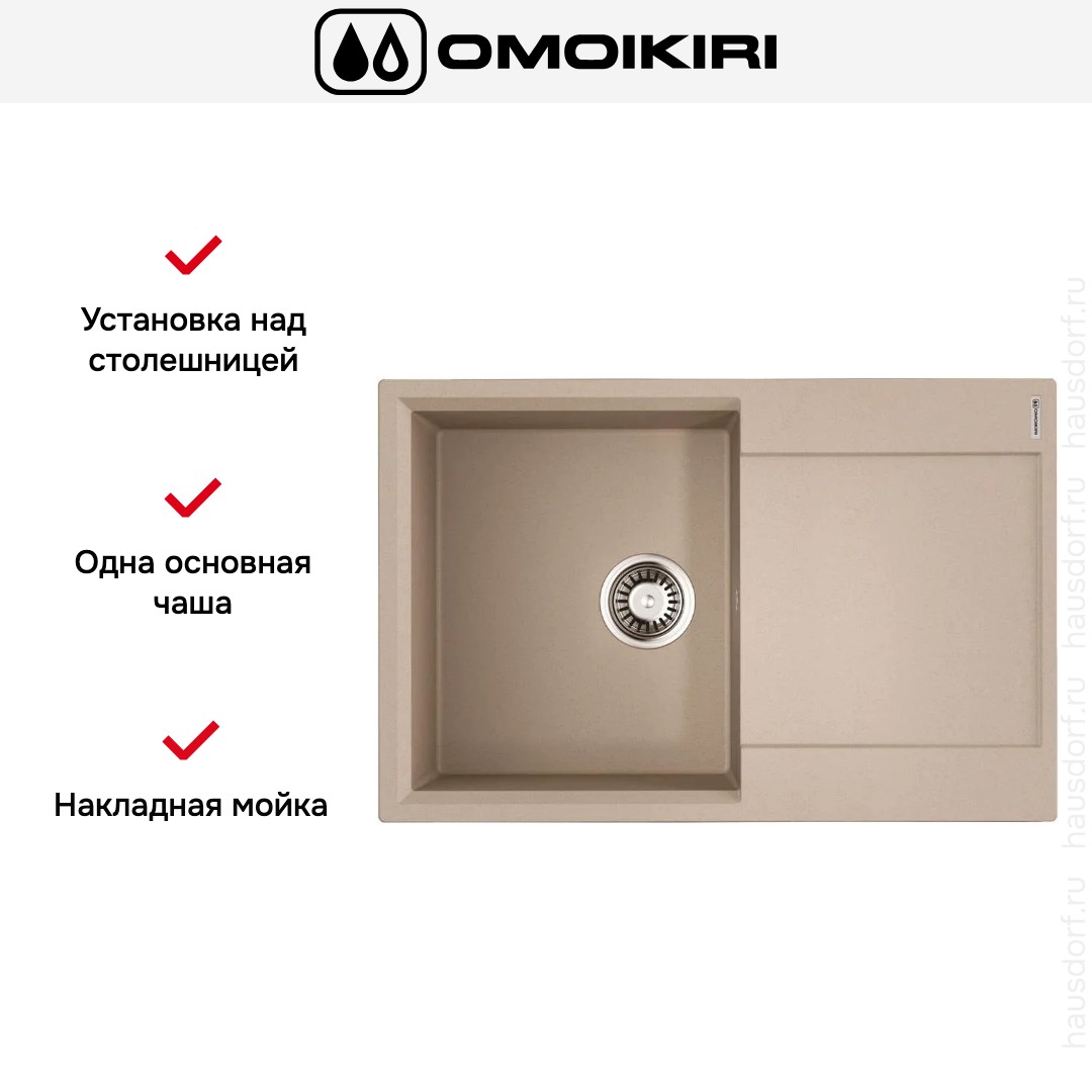 Накладная мойка Omoikiri — отличный выбор для тех, кто хочет создать гармоничное пространство с удобной сантехникой. простой в установке. Преимущество такой конструкции: легко подобрать практически к любой кухне и не придется демонтировать вместе с тумбой при ремонте или перестановке остальной мебели. Данная модель имеет стандартную форму, поэтому подходит большинству пользователей. Устанавливается над столешницей: это самый простой способ монтажа, зачастую с ним можно справиться даже без специалистов, главное — правильно рассчитать размеры ниши.