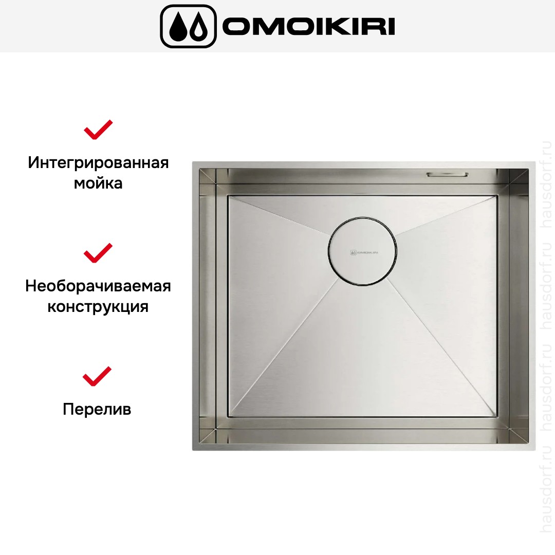 Интегрированная мойка Omoikiri — отличный выбор для тех, кто хочет создать дизайнерское кухонное пространство с полностью вписывающейся в него сантехникой. Конструкция «сливается» со столешницей в единую поверхность, в этом кроются некоторые особенности, которые нужно учитывать: нежелательно устанавливать под раковину измельчитель, при замене мебели придется заново изготавливать ее на заказ. Данная модель имеет стандартную форму, поэтому подходит большинству пользователей. Устанавливается под столешницу, благодаря чему не остается стыков, в которых копились бы загрязнения, а также увеличивается рабочая глубина.