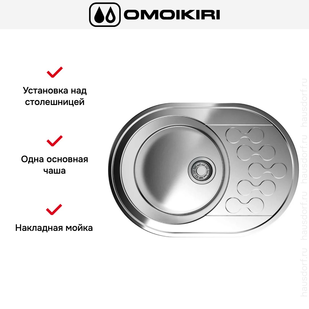 Накладная мойка Omoikiri — отличный выбор для тех, кто хочет создать гармоничное пространство с удобной сантехникой. простой в установке. Преимущество такой конструкции: легко подобрать практически к любой кухне и не придется демонтировать вместе с тумбой при ремонте или перестановке остальной мебели. Данная модель имеет скругленный контур, поэтому выбор тумбочки для нее потребует дополнительного внимания. Устанавливается над столешницей: это самый простой способ монтажа, зачастую с ним можно справиться даже без специалистов, главное — правильно рассчитать размеры ниши.