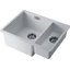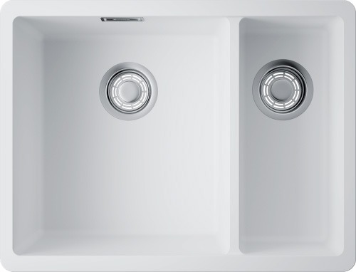 Выглядит лаконично и строго: прямоугольная форма, две продолговатые чаши в единой конструкции, универсальный белый цвет. Формат встраивания под столешницу создает ровную линию рабочей поверхности — без выступов и визуального «разрыва» между мойкой и поверхностью стола.
