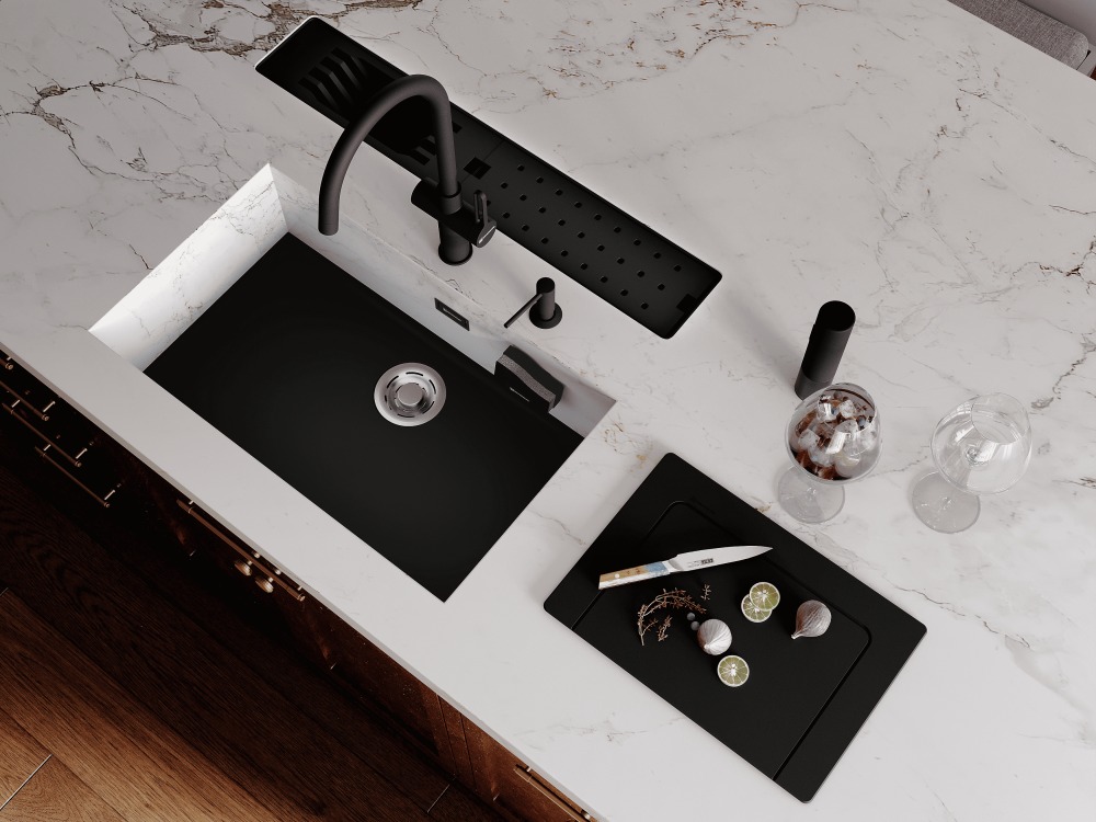 вровень со столешницей — создается ощущение бесшовного пространства, а если мойка сделана из того же материала, то и единого дизайна;