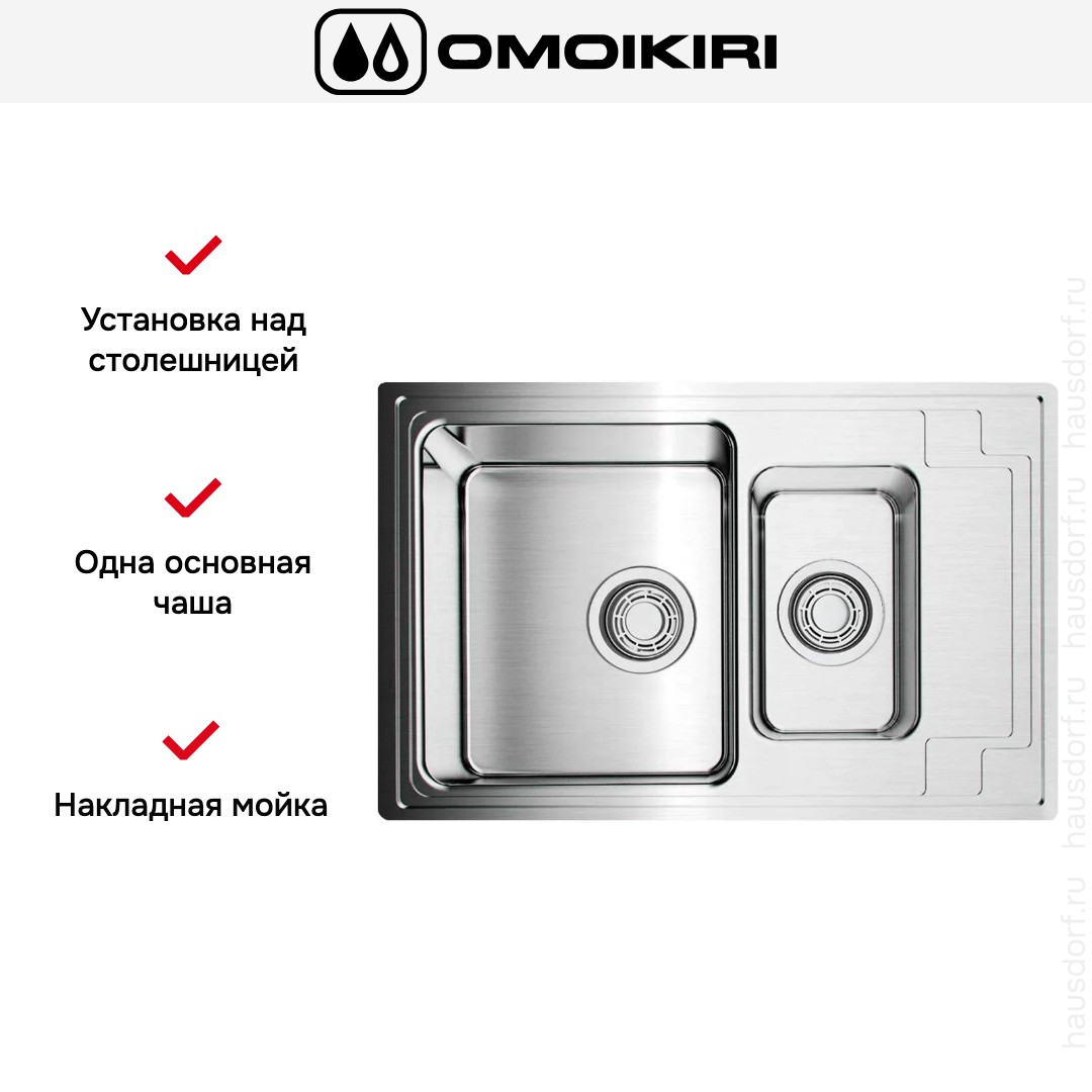 Накладная мойка Omoikiri — отличный выбор для тех, кто хочет создать гармоничное пространство с удобной сантехникой. простой в установке. Преимущество такой конструкции: легко подобрать практически к любой кухне и не придется демонтировать вместе с тумбой при ремонте или перестановке остальной мебели. Данная модель имеет стандартную форму, поэтому подходит большинству пользователей. Устанавливается над столешницей: это самый простой способ монтажа, зачастую с ним можно справиться даже без специалистов, главное — правильно рассчитать размеры ниши.