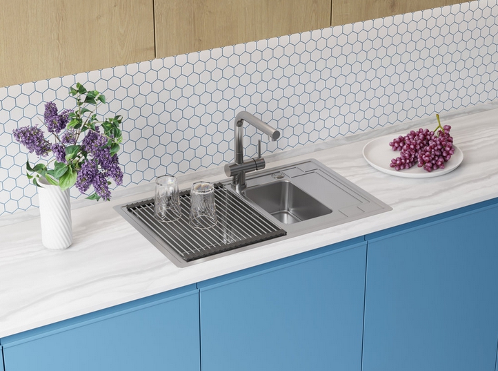 вровень со столешницей — создается ощущение бесшовного пространства, а если мойка сделана из того же материала, то и единого дизайна;