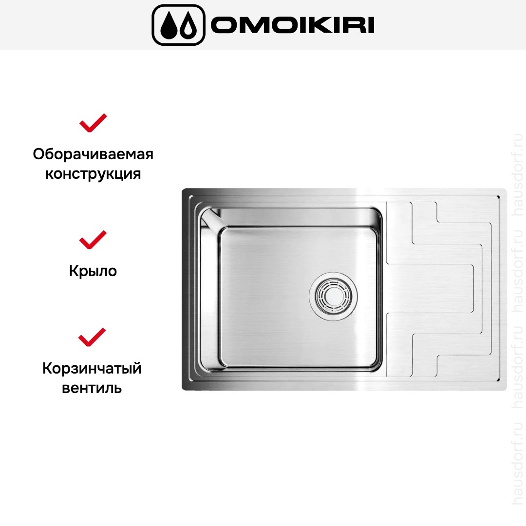 Накладная мойка Omoikiri — отличный выбор для тех, кто хочет создать гармоничное пространство с удобной сантехникой. простой в установке. Преимущество такой конструкции: легко подобрать практически к любой кухне и не придется демонтировать вместе с тумбой при ремонте или перестановке остальной мебели. Данная модель имеет стандартную форму, поэтому подходит большинству пользователей. Устанавливается над столешницей: это самый простой способ монтажа, зачастую с ним можно справиться даже без специалистов, главное — правильно рассчитать размеры ниши.
