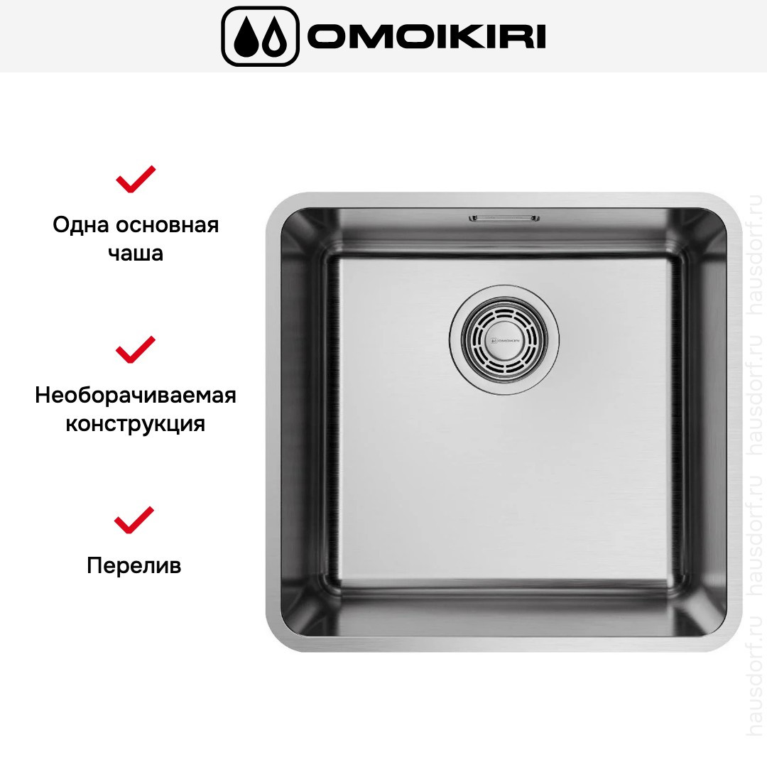 Врезная мойка Omoikiri — отличный выбор для тех, кто хочет создать гармоничное кухонное пространство с полностью вписывающейся в него сантехникой. Преимущество такой конструкции — плотное прилегание к столешнице, так как вырез подбирается индивидуально под габариты модели. Под стыки не попадает вода, поэтому срок службы значительно увеличивается, пользоваться ей удобно и приятно. Данная модель имеет стандартную форму, поэтому подходит большинству пользователей. Устанавливается под столешницу, благодаря чему не остается стыков, в которых копились бы загрязнения, а также увеличивается рабочая глубина.