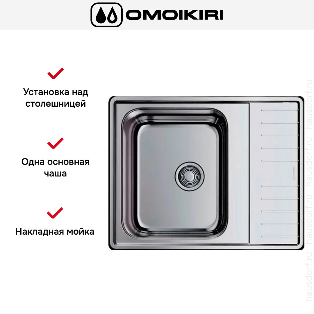 Накладная мойка Omoikiri — отличный выбор для тех, кто хочет создать гармоничное пространство с удобной сантехникой. простой в установке. Преимущество такой конструкции: легко подобрать практически к любой кухне и не придется демонтировать вместе с тумбой при ремонте или перестановке остальной мебели. Данная модель имеет стандартную форму, поэтому подходит большинству пользователей. Устанавливается над столешницей: это самый простой способ монтажа, зачастую с ним можно справиться даже без специалистов, главное — правильно рассчитать размеры ниши.