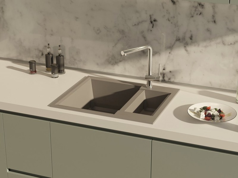Интегрированная — встраиваемая модель из того же материала, что и столешница. Благодаря этому она выглядит как часть мебели.