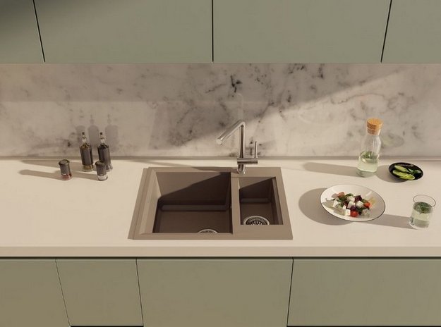 вровень со столешницей — создается ощущение бесшовного пространства, а если мойка сделана из того же материала, то и единого дизайна;