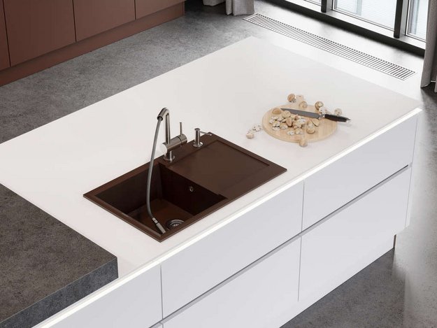 вровень со столешницей — создается ощущение бесшовного пространства, а если мойка сделана из того же материала, то и единого дизайна;