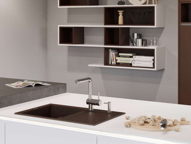 Интегрированная — встраиваемая модель из того же материала, что и столешница. Благодаря этому она выглядит как часть мебели.