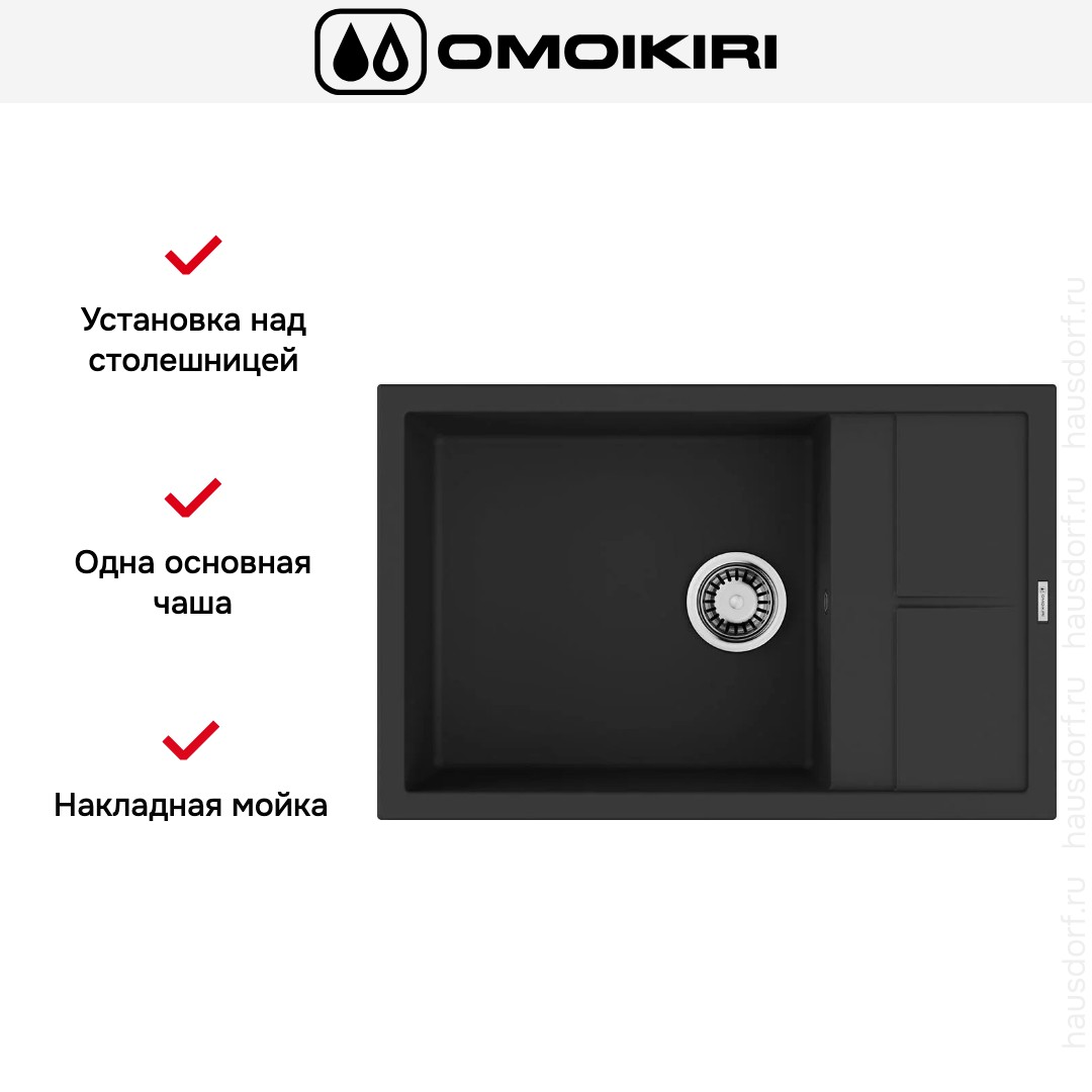 Функционально модель — накладная конструкция, устанавливаемая над столешницей, для ее установки понадобится мебельная тумба шириной 60 см. Для монтажа нужно выпилить отверстие шириной 76 см и глубиной 48 см. Конструкция оборачиваемая, поэтому расположение крыла слева или справа можно выбрать при установке. В конструкции одна основная чаша размером 49×43.5 см и вертикальной глубиной 20 см, что обеспечивает достаточный объем для повседневных задач: мытья большой посуды, разделывания птицы, чистки овощей. Присутствует перелив, а также корзинчатый вентиль и сифон в комплекте; вместе с мойкой поставляются и крепления для монтажа. .