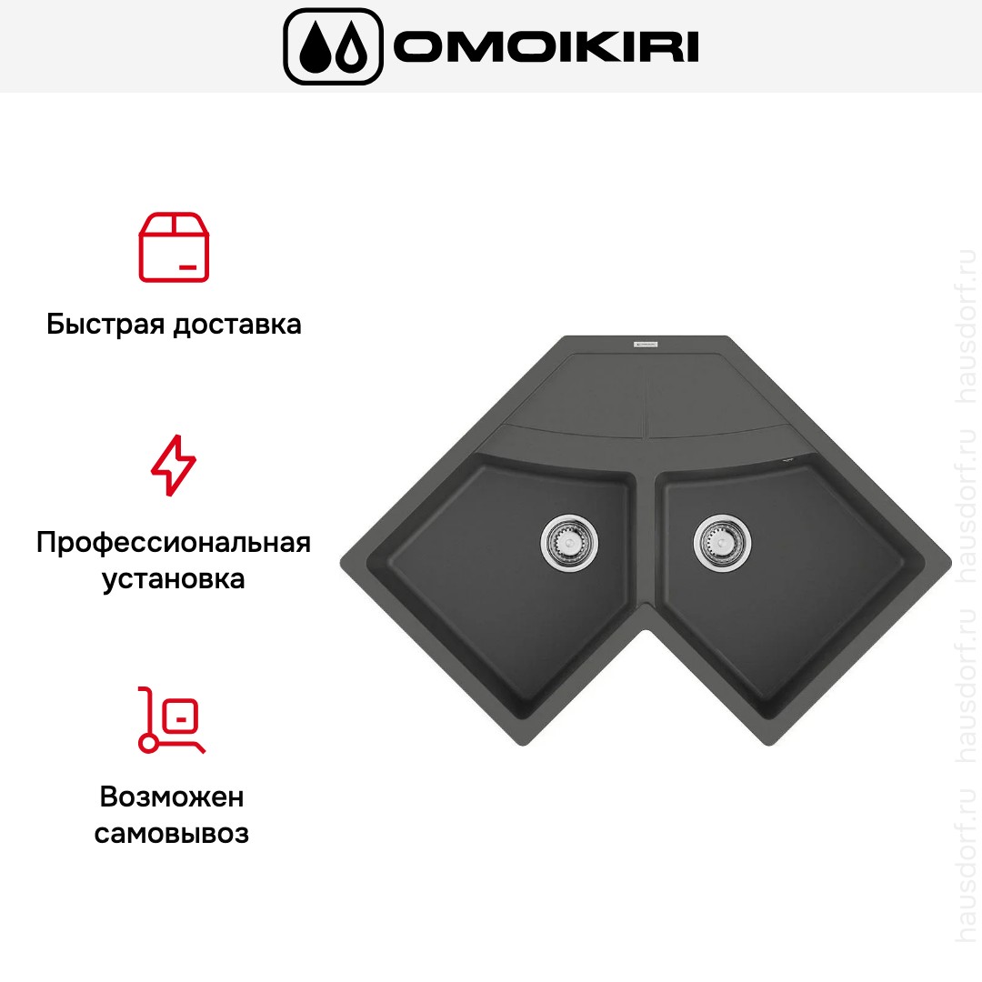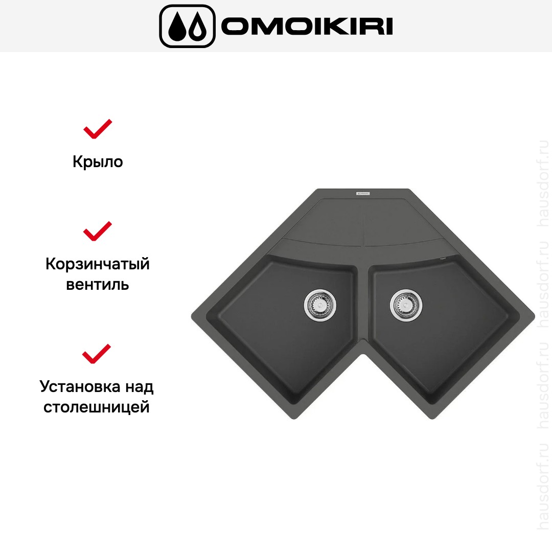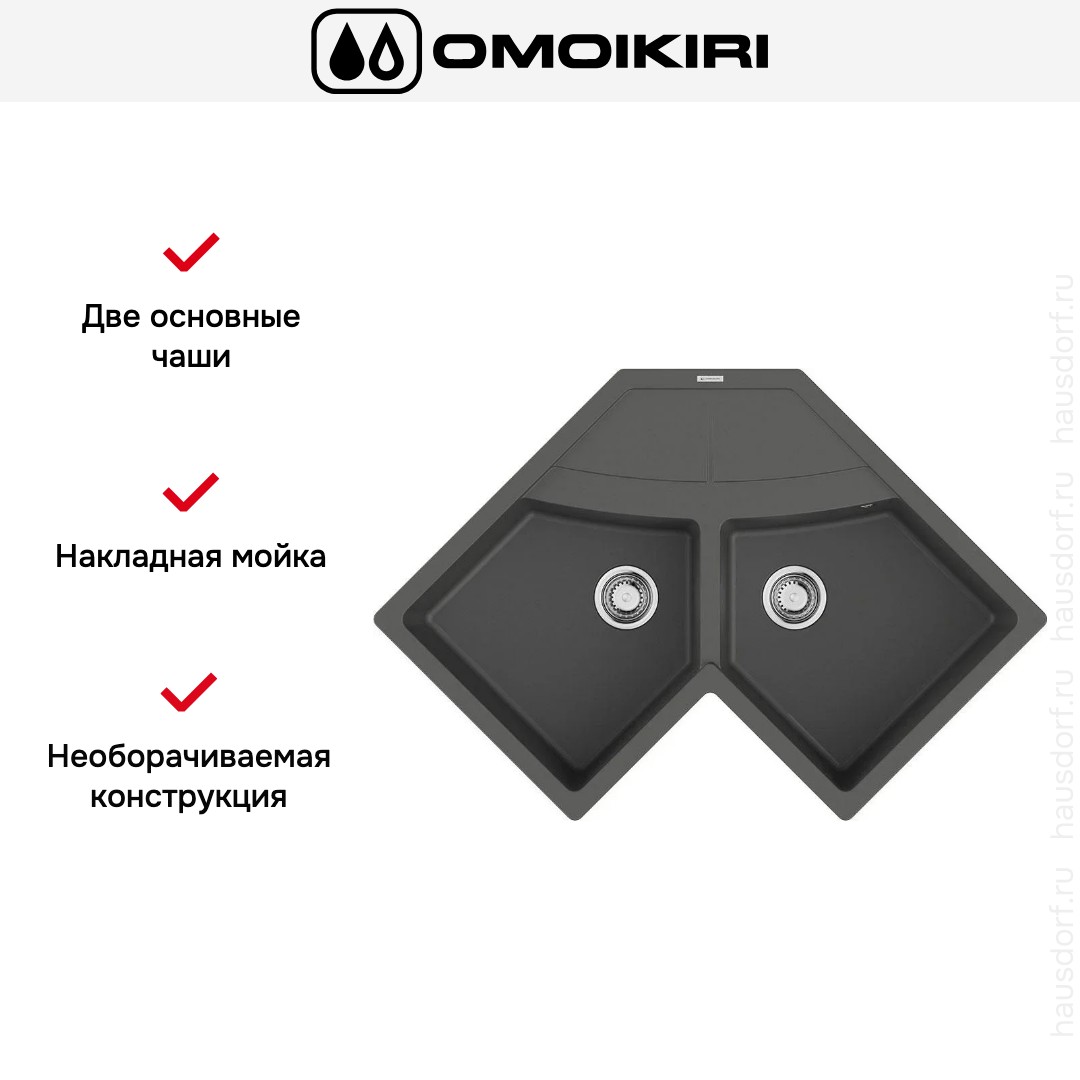 Накладная мойка Omoikiri — отличный выбор для тех, кто хочет создать гармоничное пространство с удобной сантехникой. простой в установке. Преимущество такой конструкции: легко подобрать практически к любой кухне и не придется демонтировать вместе с тумбой при ремонте или перестановке остальной мебели. Данная модель подойдет владельцам маленькой или нестандартной кухни; благодаря угловому размещению она освобождает пространство по бокам для работы или размещения кухонной техники. Устанавливается над столешницей: это самый простой способ монтажа, зачастую с ним можно справиться даже без специалистов, главное — правильно рассчитать размеры ниши.