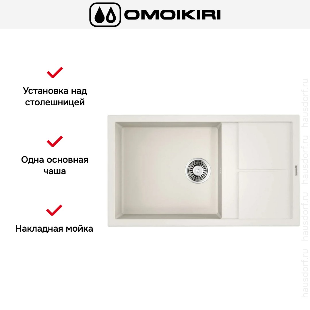 Накладная мойка Omoikiri — отличный выбор для тех, кто хочет создать гармоничное пространство с удобной сантехникой. простой в установке. Преимущество такой конструкции: легко подобрать практически к любой кухне и не придется демонтировать вместе с тумбой при ремонте или перестановке остальной мебели. Данная модель имеет стандартную форму, поэтому подходит большинству пользователей. Устанавливается над столешницей: это самый простой способ монтажа, зачастую с ним можно справиться даже без специалистов, главное — правильно рассчитать размеры ниши.