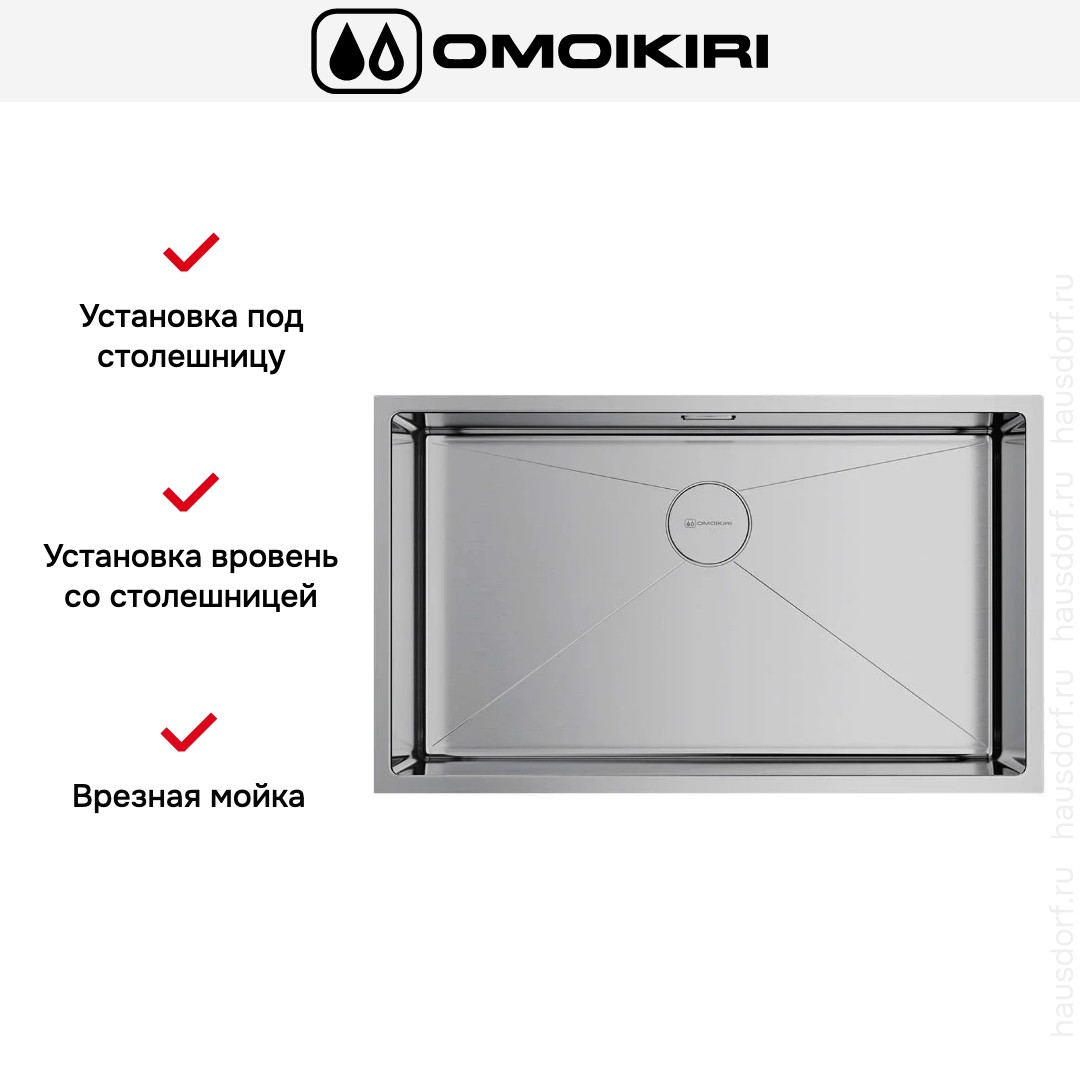 Врезная мойка Omoikiri — отличный выбор для тех, кто хочет создать гармоничное кухонное пространство с полностью вписывающейся в него сантехникой. Преимущество такой конструкции — плотное прилегание к столешнице, так как вырез подбирается индивидуально под габариты модели. Под стыки не попадает вода, поэтому срок службы значительно увеличивается, пользоваться ей удобно и приятно. Данная модель имеет стандартную форму, поэтому подходит большинству пользователей. Устанавливается вровень со столешницей, благодаря чему не остается стыков, в которых копились бы загрязнения. Устанавливается под столешницу, благодаря чему не остается стыков, в которых копились бы загрязнения, а также увеличивается рабочая глубина. Устанавливается над столешницей: это самый простой способ монтажа, зачастую с ним можно справиться даже без специалистов, главное — правильно рассчитать размеры ниши.