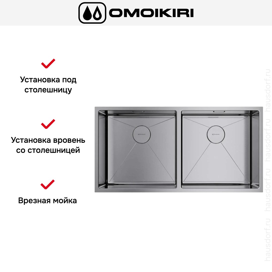 Врезная мойка Omoikiri — отличный выбор для тех, кто хочет создать гармоничное кухонное пространство с полностью вписывающейся в него сантехникой. Преимущество такой конструкции — плотное прилегание к столешнице, так как вырез подбирается индивидуально под габариты модели. Под стыки не попадает вода, поэтому срок службы значительно увеличивается, пользоваться ей удобно и приятно. Данная модель имеет стандартную форму, поэтому подходит большинству пользователей. Устанавливается вровень со столешницей, благодаря чему не остается стыков, в которых копились бы загрязнения. Устанавливается под столешницу, благодаря чему не остается стыков, в которых копились бы загрязнения, а также увеличивается рабочая глубина. Устанавливается над столешницей: это самый простой способ монтажа, зачастую с ним можно справиться даже без специалистов, главное — правильно рассчитать размеры ниши.