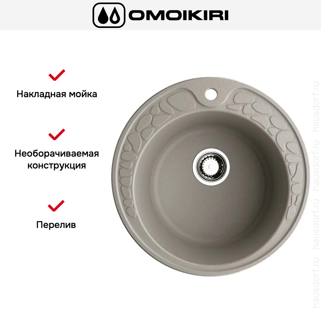 Мойка Omoikiri Tovada 51 GR имеет округлую форму и выполнена в спокойном сдержанном цвете «Серый Ленинград». Она является накладной и устанавливается поверх столешницы. Круглая геометрия делает изделие органичным элементом любой рабочей зоны. За счёт лаконичных линий оно не перегружает интерьер.
