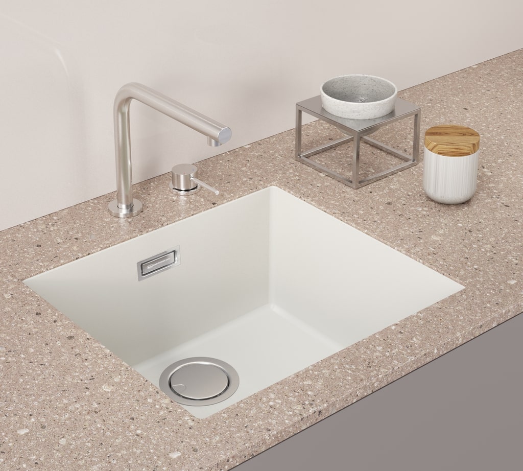 Интегрированная — встраиваемая модель из того же материала, что и столешница. Благодаря этому она выглядит как часть мебели.