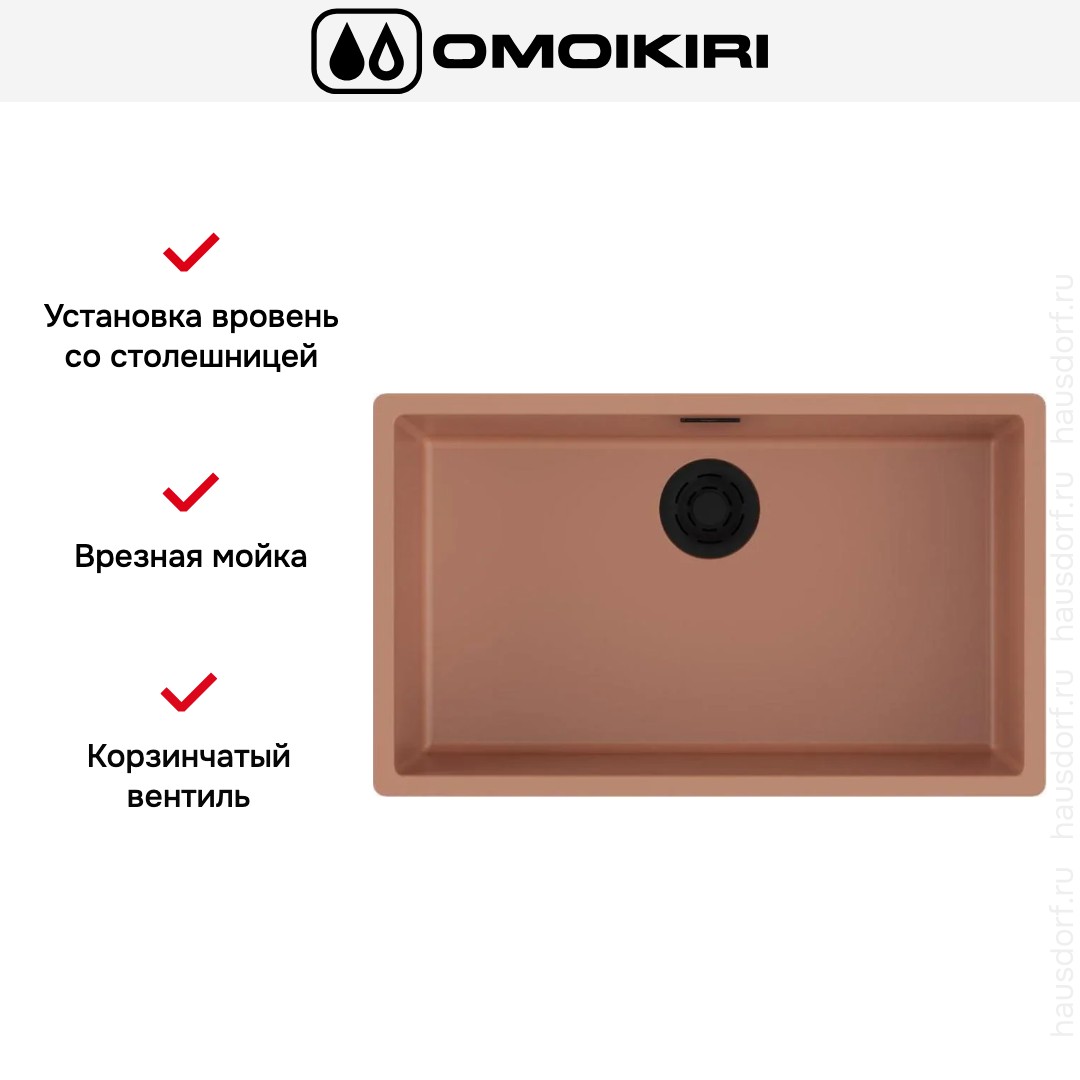 Мойка Omoikiri Yamakawa 75 Integra CN имеет прямоугольную форму и предназначена для врезной установки вровень со столешницей, что обеспечивает минималистичный вид рабочей зоны. Благодаря продуманным габаритам 75.145.1 см изделие гармонично встанет в стандартную кухонную мебель и оставит достаточно места на столешнице для бытовых аксессуаров. Красно-коричневый оттенок придаёт интерьеру тёплую, благородную ноту и легко сочетается с деревом, камнем и тёмными покрытиями.