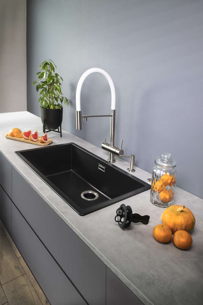 Интегрированная — встраиваемая модель из того же материала, что и столешница. Благодаря этому она выглядит как часть мебели.