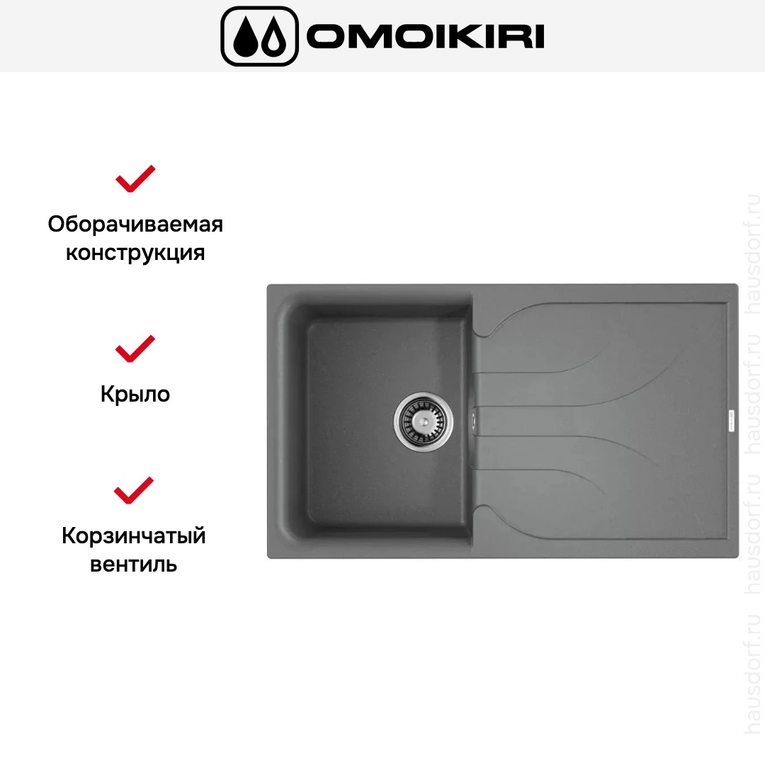 Обратите внимание на дизайнерские отличия мойки Омойкири, которые помогут в создании идеальной кухни в вашем доме. Она выполнена в цвете Серый Ленинград. Крыло, расположенное является дополнительным рабочим пространством, на котором можно сушить посуду, разделывать мясо и нарезать овощи.