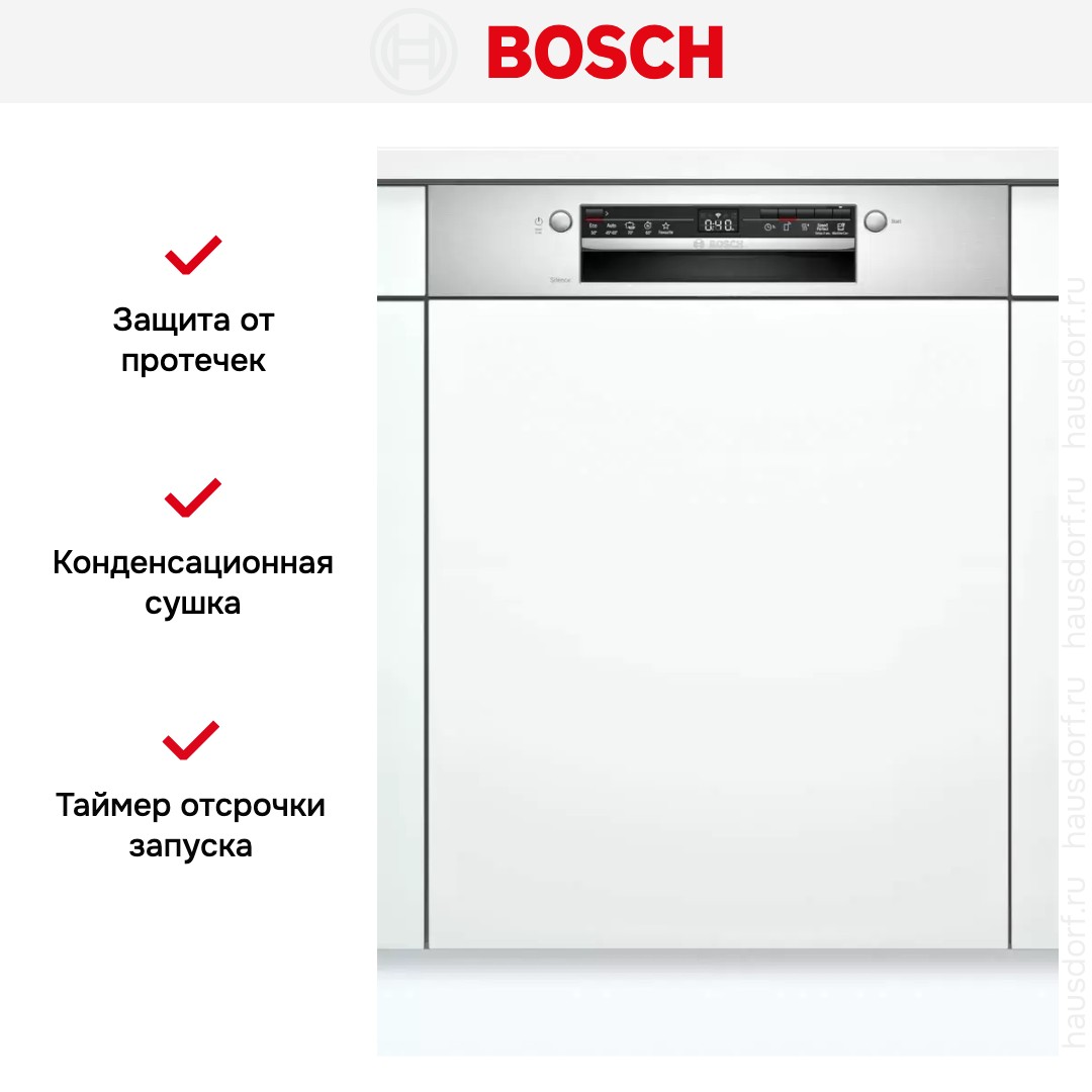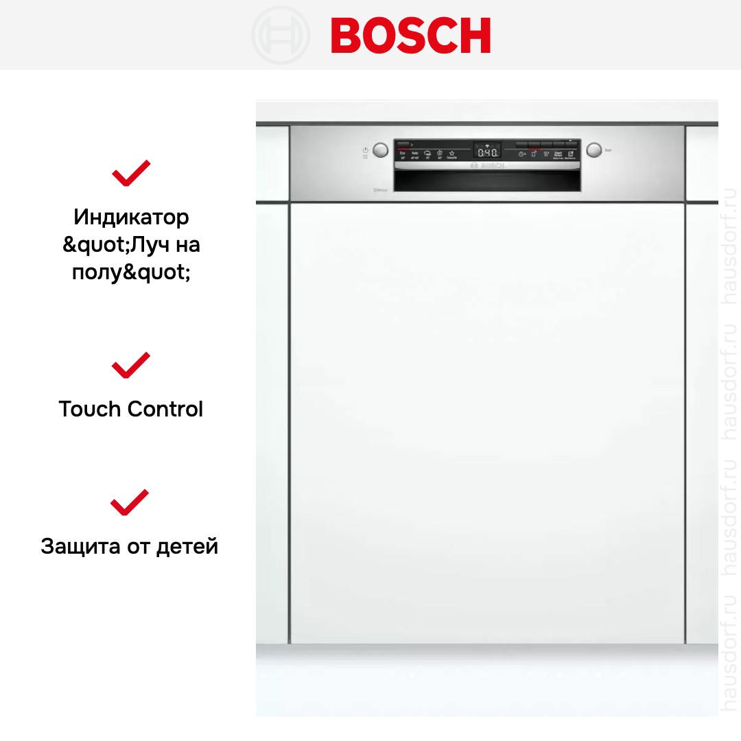 Встраиваемая модель Бош отлично впишется в любой интерьер, главное — правильно выбрать место, чтобы подвести коммуникации. Устанавливается в нишу целиком, полностью закрывается декоративной панелью. Обратите внимание: в комплекте не идет фасад, его необходимо установить самостоятельно. Имеет стандартные размеры, поэтому может не поместиться на очень маленькой кухне. В камеру можно загрузить ограниченное число комплектов: 12 шт. Комплектом считается набор посуды на одного человека, который нужен для полноценного приема пищи: глубокая и плоская тарелки, тарелка для салата, блюдце под чашку, сама чашка, ложка и вилка.