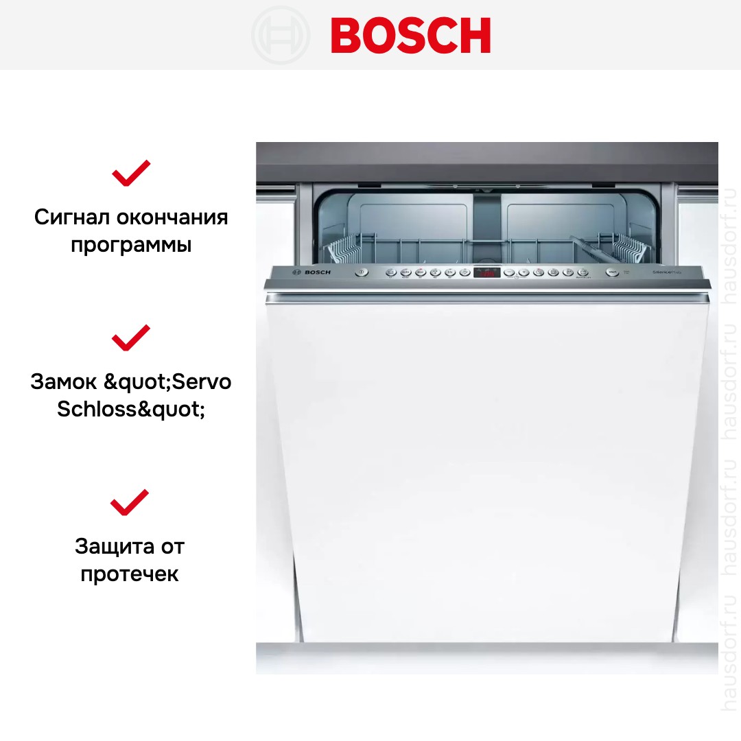 Встраиваемая модель Бош отлично впишется в любой интерьер, главное — правильно выбрать место, чтобы подвести коммуникации. Устанавливается в нишу целиком, полностью закрывается декоративной панелью. Обратите внимание: в комплекте не идет фасад, его необходимо установить самостоятельно. Имеет стандартные размеры, поэтому может не поместиться на очень маленькой кухне. В камеру можно загрузить ограниченное число комплектов: 12 шт. Комплектом считается набор посуды на одного человека, который нужен для полноценного приема пищи: глубокая и плоская тарелки, тарелка для салата, блюдце под чашку, сама чашка, ложка и вилка.
