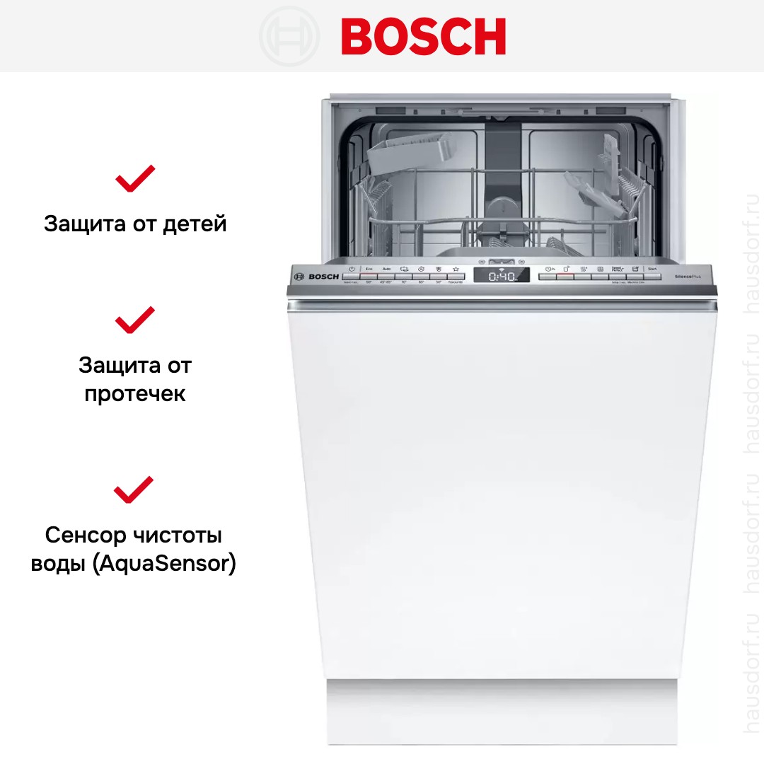Встраиваемая посудомоечная машина Bosch SPV4HKX10E — компактное и энергоэффективное решение для современной кухни, сочетающее надёжность, тихую работу и высокое качество очистки. Модель рассчитана на загрузку до 10 комплектов посуды, что делает её идеальной для небольшой семьи или квартир с ограниченным пространством. Благодаря продуманной внутренней организации, регулируемой верхней корзине и складным держателям легко размещаются как столовые приборы, так и объёмные кастрюли, сковороды или хрупкие бокалы.