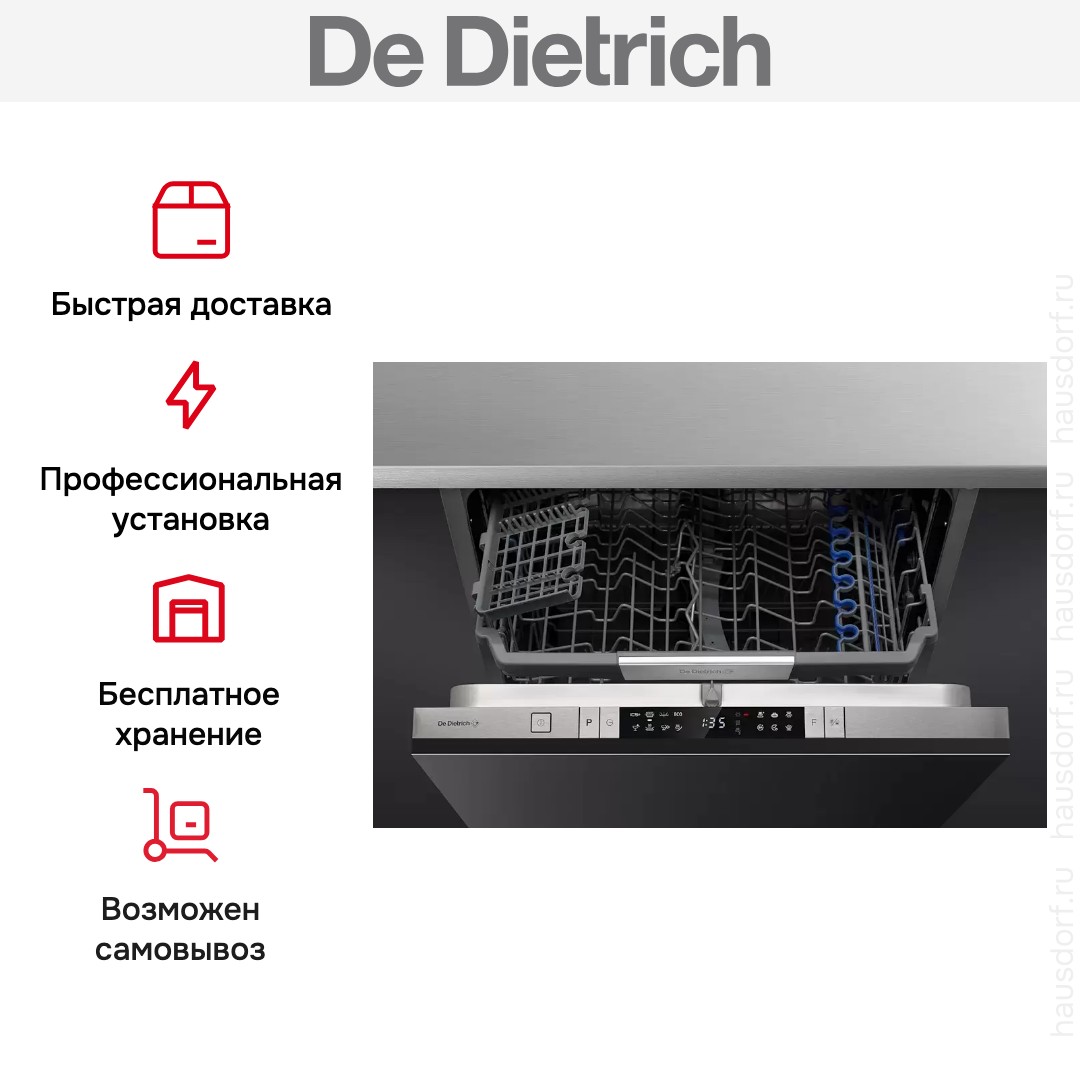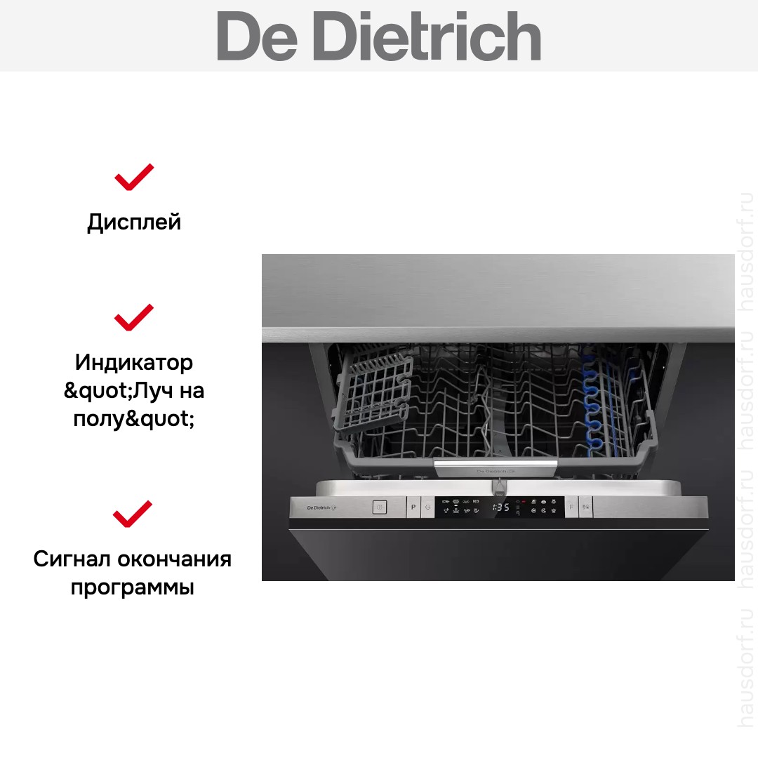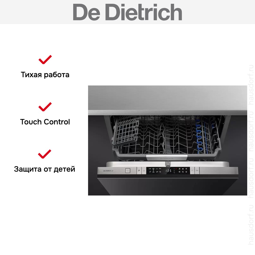 Встраиваемая модель Де Дитрих отлично впишется в любой интерьер, главное — правильно выбрать место, чтобы подвести коммуникации. Устанавливается в нишу целиком, полностью закрывается декоративной панелью. Обратите внимание: в комплекте не идет фасад, его необходимо установить самостоятельно. Имеет стандартные размеры, поэтому может не поместиться на очень маленькой кухне. В камеру можно загрузить ограниченное число комплектов: 14 шт. Комплектом считается набор посуды на одного человека, который нужен для полноценного приема пищи: глубокая и плоская тарелки, тарелка для салата, блюдце под чашку, сама чашка, ложка и вилка.