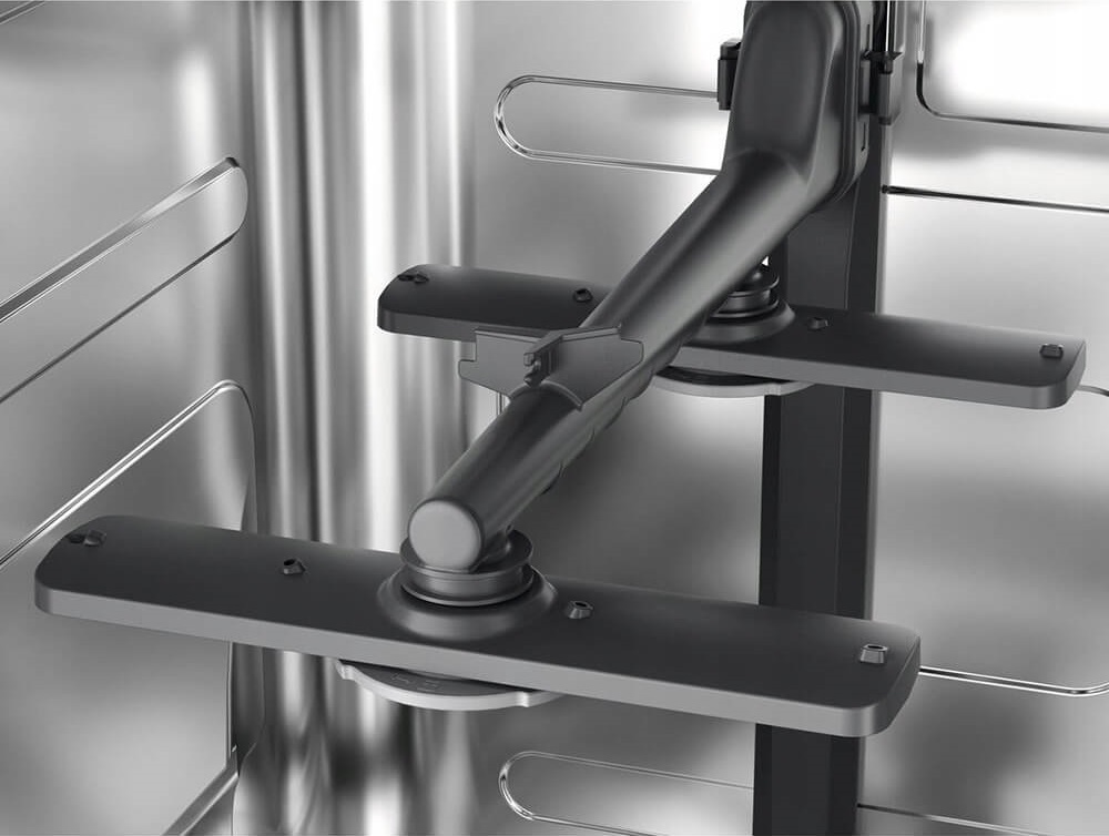 Как известно, принцип работы посудомоечной машины состоит в том, что на посуду в корзинах воздействуют сильные струи воды, которые подаются сквозь специальные форсунки во вращающихся разбрызгивателях-коромыслах. Класс мытья определяется, исходя из количества разбрызгивателей и форсунок, а также их диаметра — чем больше отверстий и чем меньше их диаметр, тем выше класс. Имеет значение также и расположение отверстий, так как струи воды не должны пересекаться — это мешает точности попадания в нужные места, а значит, и эффективности мытья. Кроме того, в камере не должно оставаться «слепых» зон, куда вода попадать не будет.