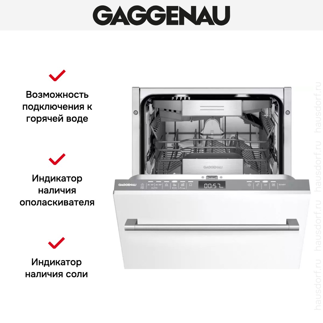 Встраиваемая модель Гаггенау отлично впишется в любой интерьер, главное — правильно выбрать место, чтобы подвести коммуникации. Устанавливается в нишу целиком, полностью закрывается декоративной панелью. Обратите внимание: в комплекте не идет фасад, его необходимо установить самостоятельно. Имеет уменьшенную ширину — благодаря этому поместится даже на очень маленькой кухне. В камеру можно загрузить ограниченное число комплектов: 10 шт. Комплектом считается набор посуды на одного человека, который нужен для полноценного приема пищи: глубокая и плоская тарелки, тарелка для салата, блюдце под чашку, сама чашка, ложка и вилка.