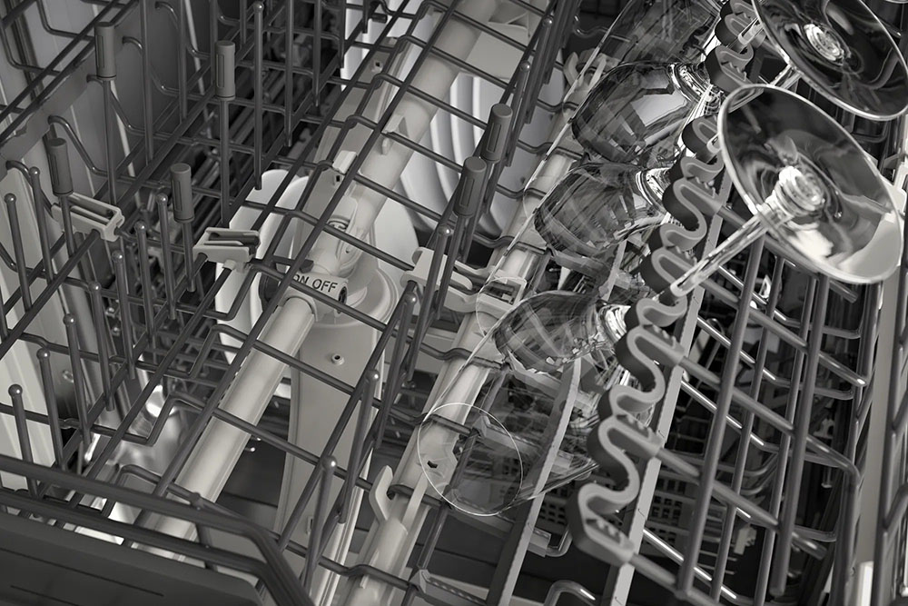 Как известно, принцип работы посудомоечной машины состоит в том, что на посуду в корзинах воздействуют сильные струи воды, которые подаются сквозь специальные форсунки во вращающихся разбрызгивателях-коромыслах. Класс мытья определяется, исходя из количества разбрызгивателей и форсунок, а также их диаметра — чем больше отверстий и чем меньше их диаметр, тем выше класс. Имеет значение также и расположение отверстий, так как струи воды не должны пересекаться — это мешает точности попадания в нужные места, а значит, и эффективности мытья. Кроме того, в камере не должно оставаться «слепых» зон, куда вода попадать не будет.