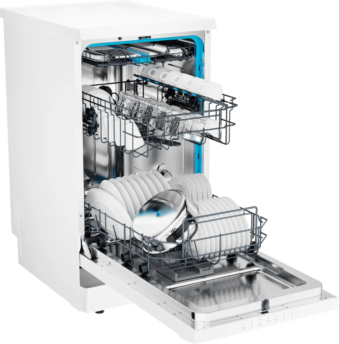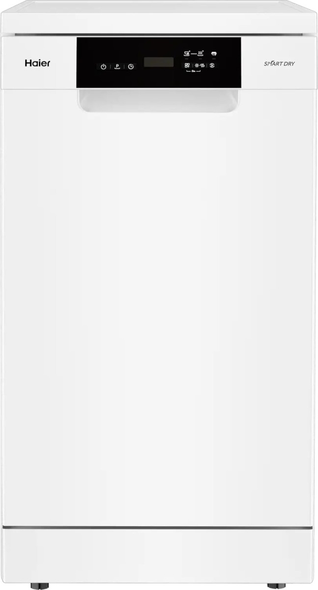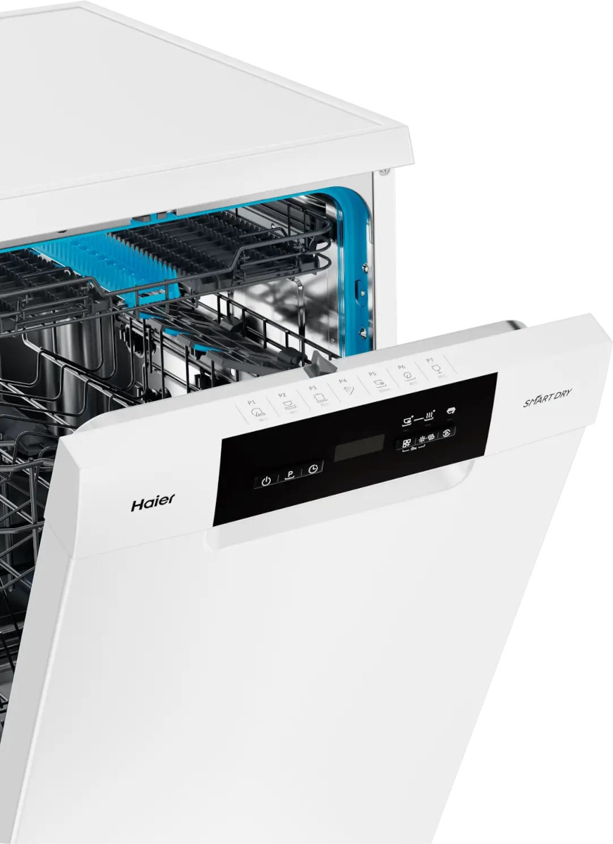 Отдельностоящая модель Хайер отлично впишется в кухонный интерьер, главное — правильно выбрать место, чтобы подвести коммуникации. Имеет уменьшенную ширину — благодаря этому поместится даже на очень маленькой кухне. В камеру можно загрузить ограниченное число комплектов: 11 шт. Комплектом считается набор посуды на одного человека, который нужен для полноценного приема пищи: глубокая и плоская тарелки, тарелка для салата, блюдце под чашку, сама чашка, ложка и вилка.