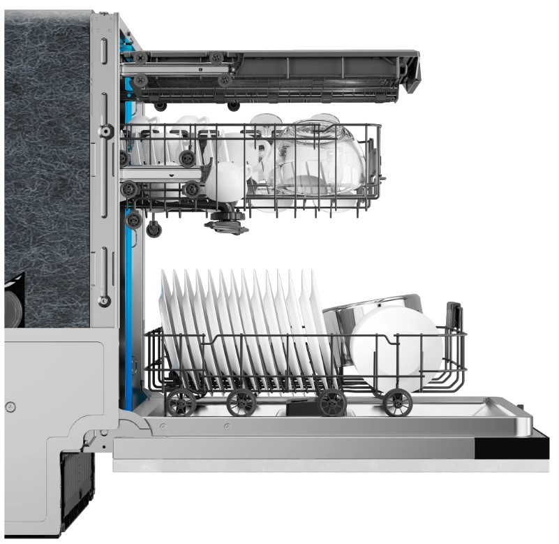 Полноразмерные модели выбирают в больших семьях, а также те, кто много готовит или часто принимает гостей. Их вместимость может составить до 15 комплектов посуды, а габаритные размеры соответствуют размерам стандартной кухонной мебели шириной и глубиной 60 см и высотой 82-85 см. Они выпускаются как во встраиваемом, так и в отдельностоящем варианте: во втором случае для установки понадобится достаточно много места. Как правило, полноразмерные приборы отличаются большим набором стандартных и специальных программ мойки, а также дополнительных опций: в частности, они оснащаются третьей корзиной для мытья столовых приборов.