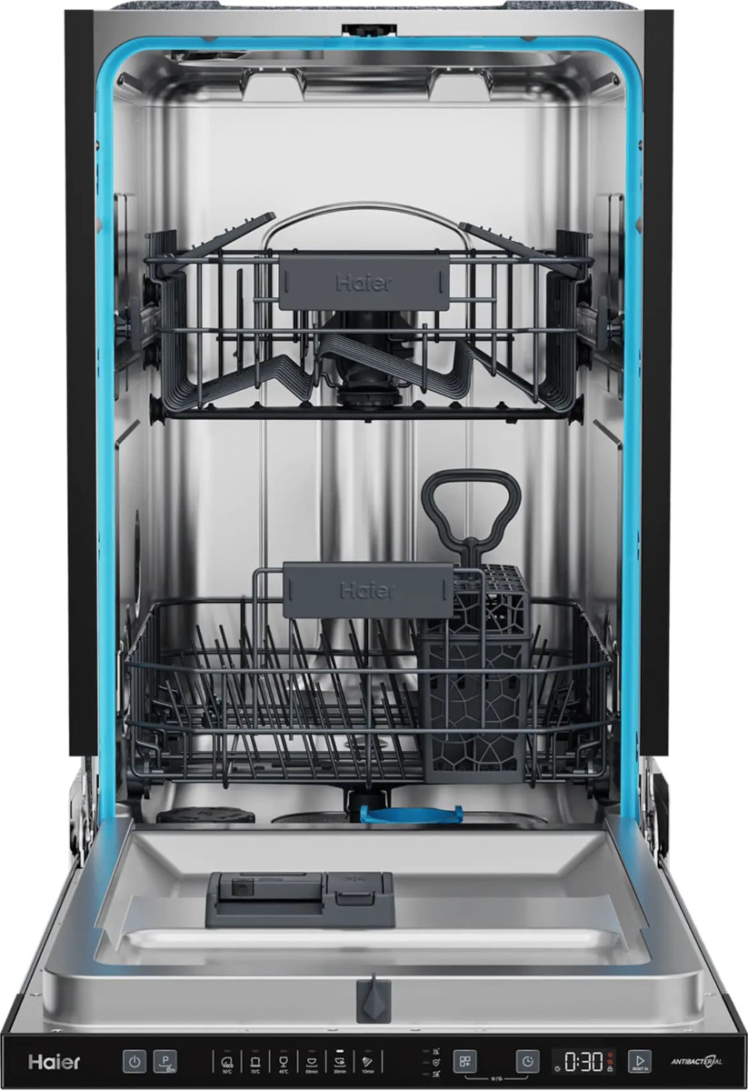 Встраиваемая модель Хайер отлично впишется в любой интерьер, главное — правильно выбрать место, чтобы подвести коммуникации. Устанавливается в нишу целиком, полностью закрывается декоративной панелью. Обратите внимание: в комплекте не идет фасад, его необходимо установить самостоятельно. Имеет уменьшенную ширину — благодаря этому поместится даже на очень маленькой кухне. В камеру можно загрузить ограниченное число комплектов: 9 шт. Комплектом считается набор посуды на одного человека, который нужен для полноценного приема пищи: глубокая и плоская тарелки, тарелка для салата, блюдце под чашку, сама чашка, ложка и вилка.