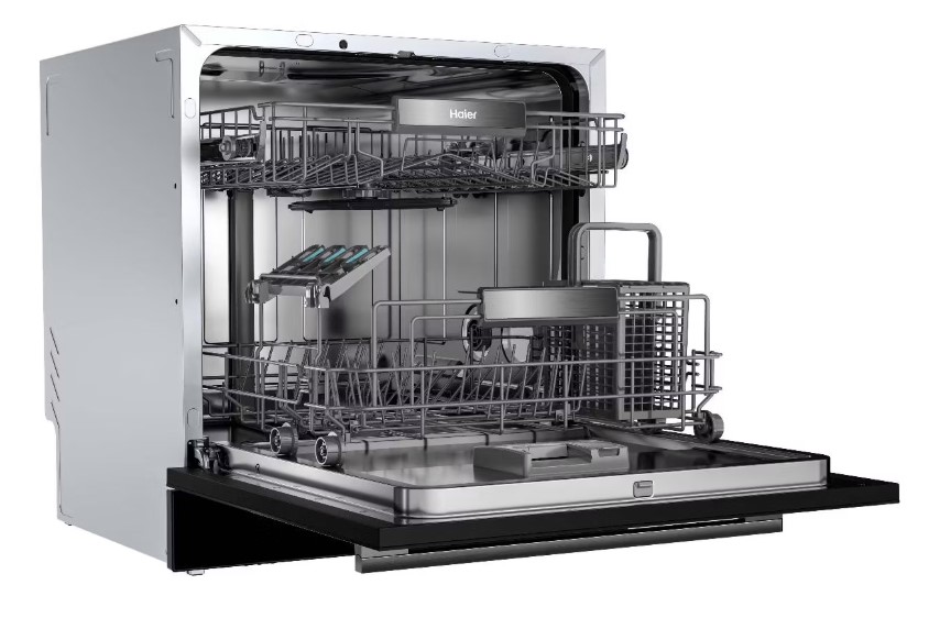 Устанавливается в нишу неполностью, остается открытой панель управления. Имеет стандартные размеры, поэтому может не поместиться на очень маленькой кухне. В камеру можно загрузить ограниченное число комплектов: 8 шт. Комплектом считается набор посуды на одного человека, который нужен для полноценного приема пищи: глубокая и плоская тарелки, тарелка для салата, блюдце под чашку, сама чашка, ложка и вилка.
